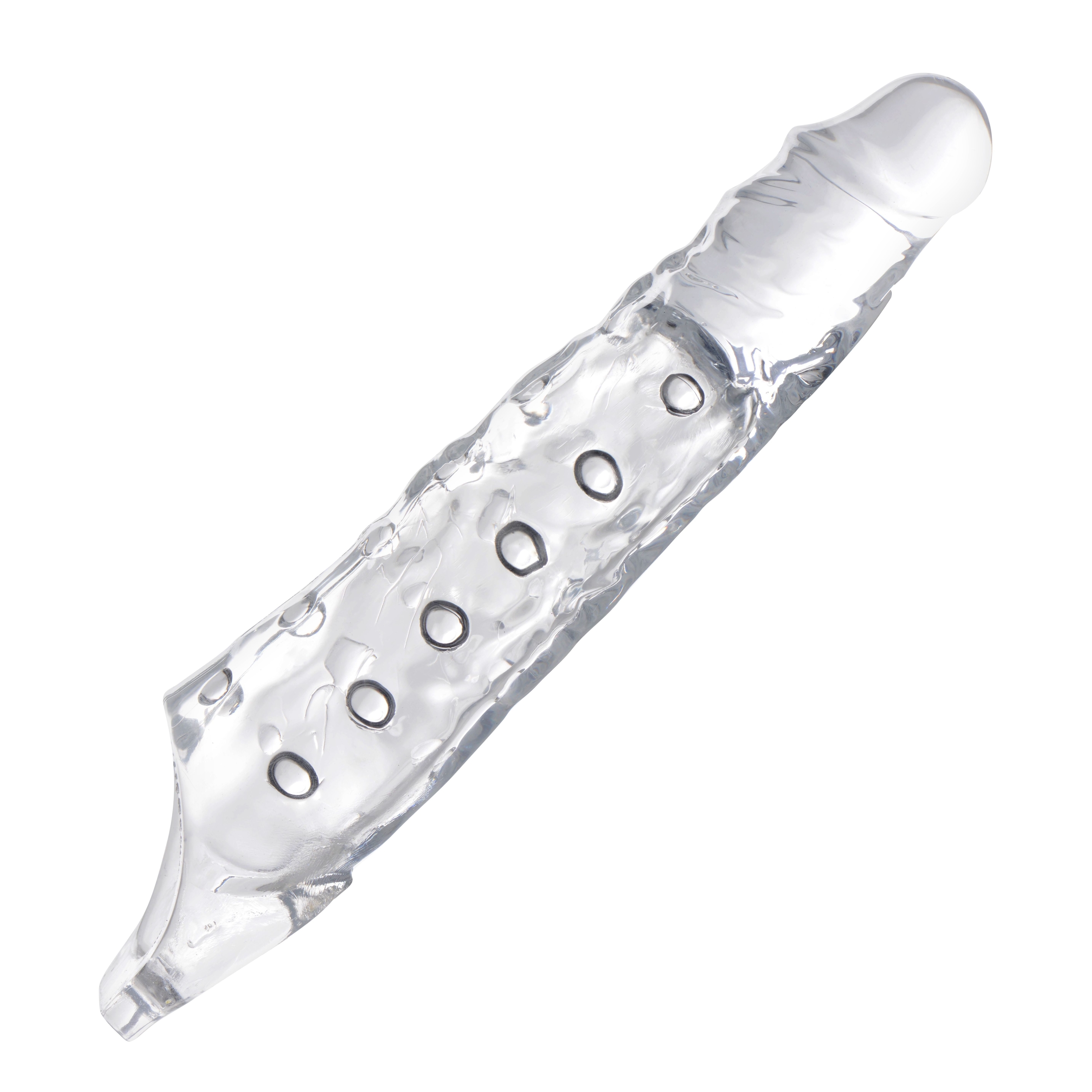 Wrap the strap around your scrotum for more support, security, and sensitivity! Gain three inches of solid length and about an inch of girth with this penis enhancing sleeve! The firm, but flexible material feels realistic, with a bold head and bulging veins all down the shaft. Just lube up and shove your dick inside to give your partner a new sensation to try out during sex! The solid 3 inch tip is followed by a hollow interior that allows for a snug and secure fit. You will love the huge nubs massaging your member on the inside. This phthalate-free and body-safe material is compatible with silicone and water-based lubricants. Use warm water and mild soap or a toy cleaner to clean after use.