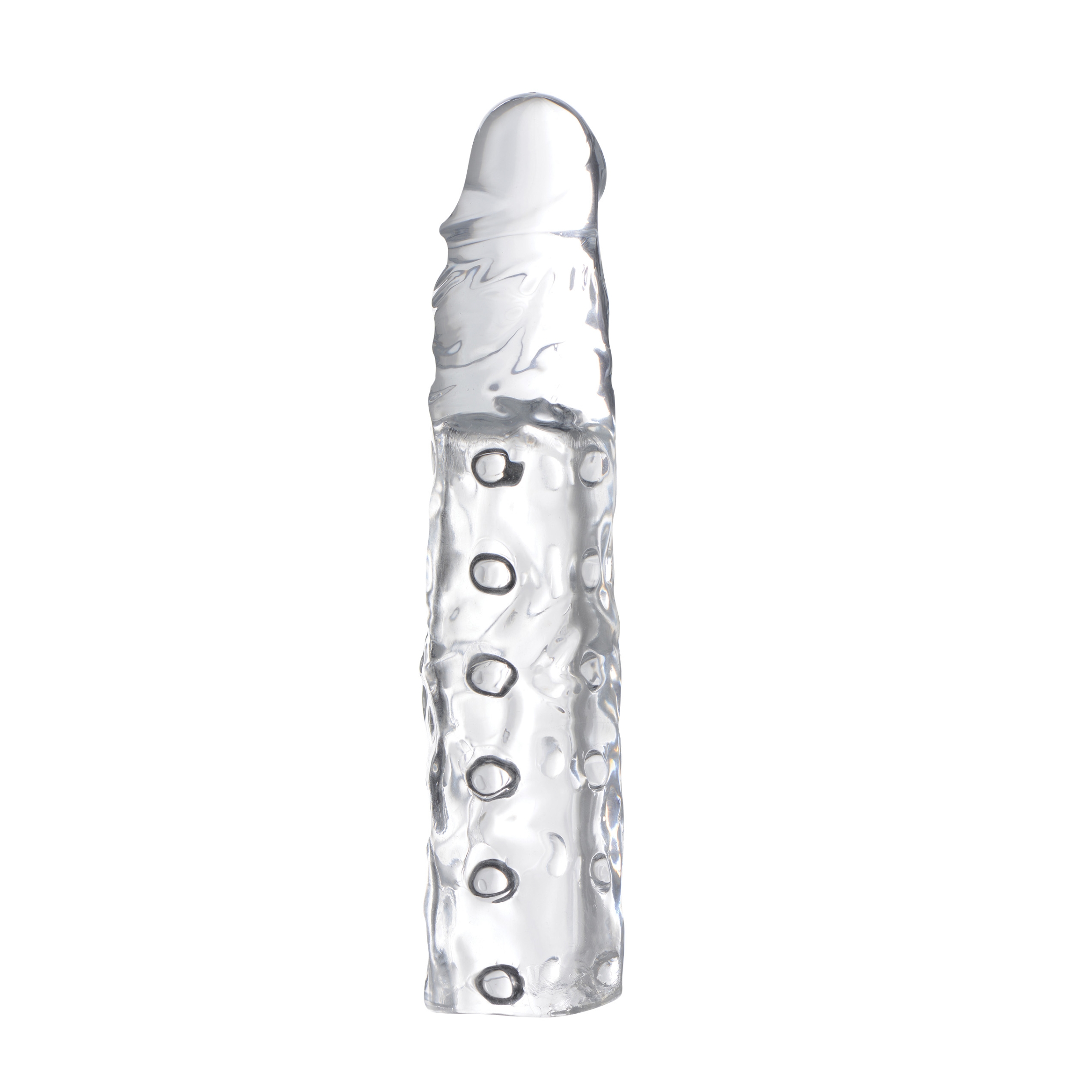 Gain three inches of solid length and about an inch of girth with this penis enhancing sleeve! The firm, but flexible material feels realistic, with a bold head and bulging veins all down the shaft. Just lube up and shove your dick inside to give your partner a new sensation to try out during sex! The solid 3 inch tip is followed by a hollow interior that allows for a snug and secure fit. You will love the huge nubs massaging your member on the inside. Create a custom fit by trimming the bottom of the sleeve to the perfect size! This material is compatible with silicone and water-based lubricants. Use warm water and mild soap or a toy cleaner to clean after use.