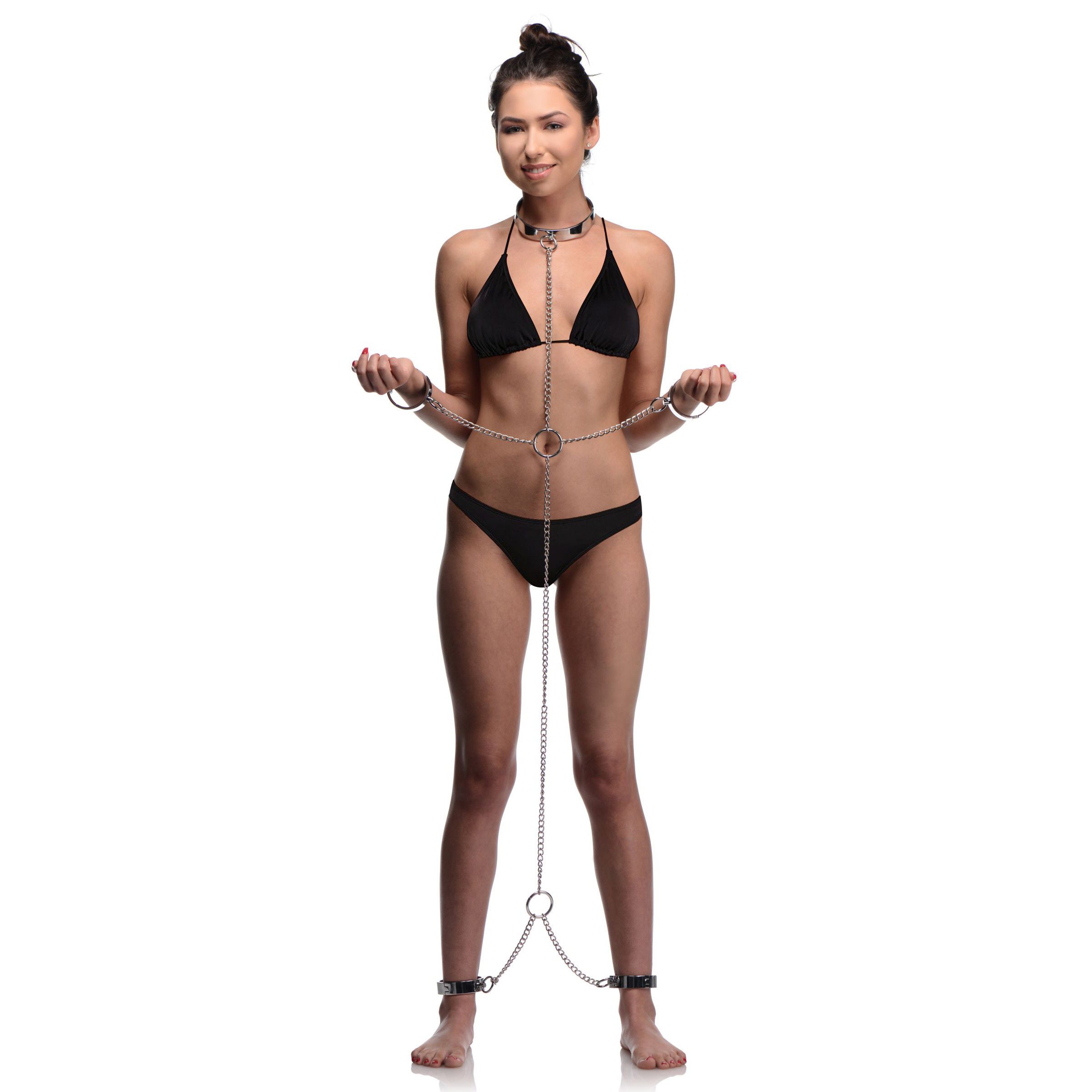 This beautiful stainless steel manacle set will limit your slaves mobility and serve as a reminder of your total control. The chrome collar and each elegant cuff feature a pinhole locking mechanism that is invisible while adorning your partner, but easy to unlatch with the key. All five accessories are connected via their O-rings to a series of chains to create a full-body restraint. Keep your slave on their feet or force them on all fours to show off this stunning bondage set.