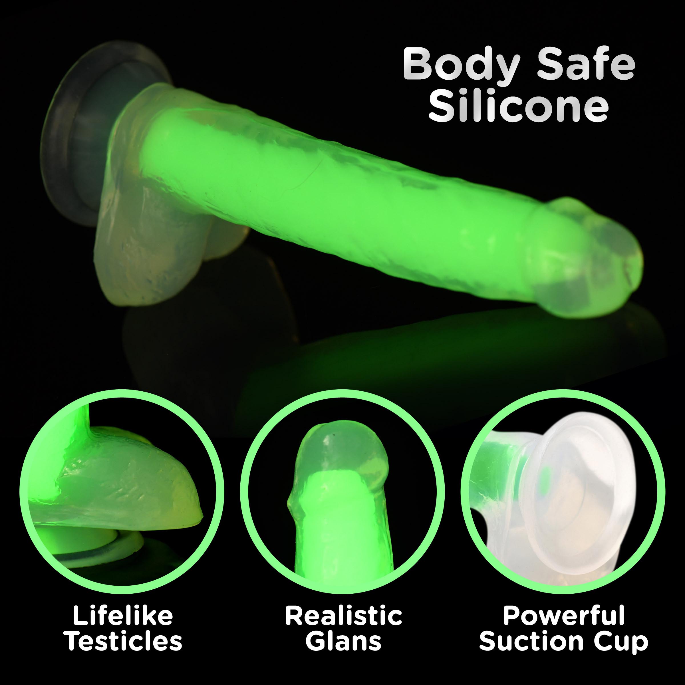 Glow-In-The-Dark Silicone: This amazing, glow-in-the-dark dildo is made of body-safe, phthalate-free, premium silicone and can be used with water-based lubricants.Firm and Flexible with Balls: Enjoy the firm core that keeps it meaty and the flexible bend to this delicious dildo! See if you can get all the way down to the balls!Harness Compatible: Use it with a compatible strapon harness for pegging play!Suction Cup Base: Go hands-free when you place this strong, suction cup base on any flat surface to ride it!