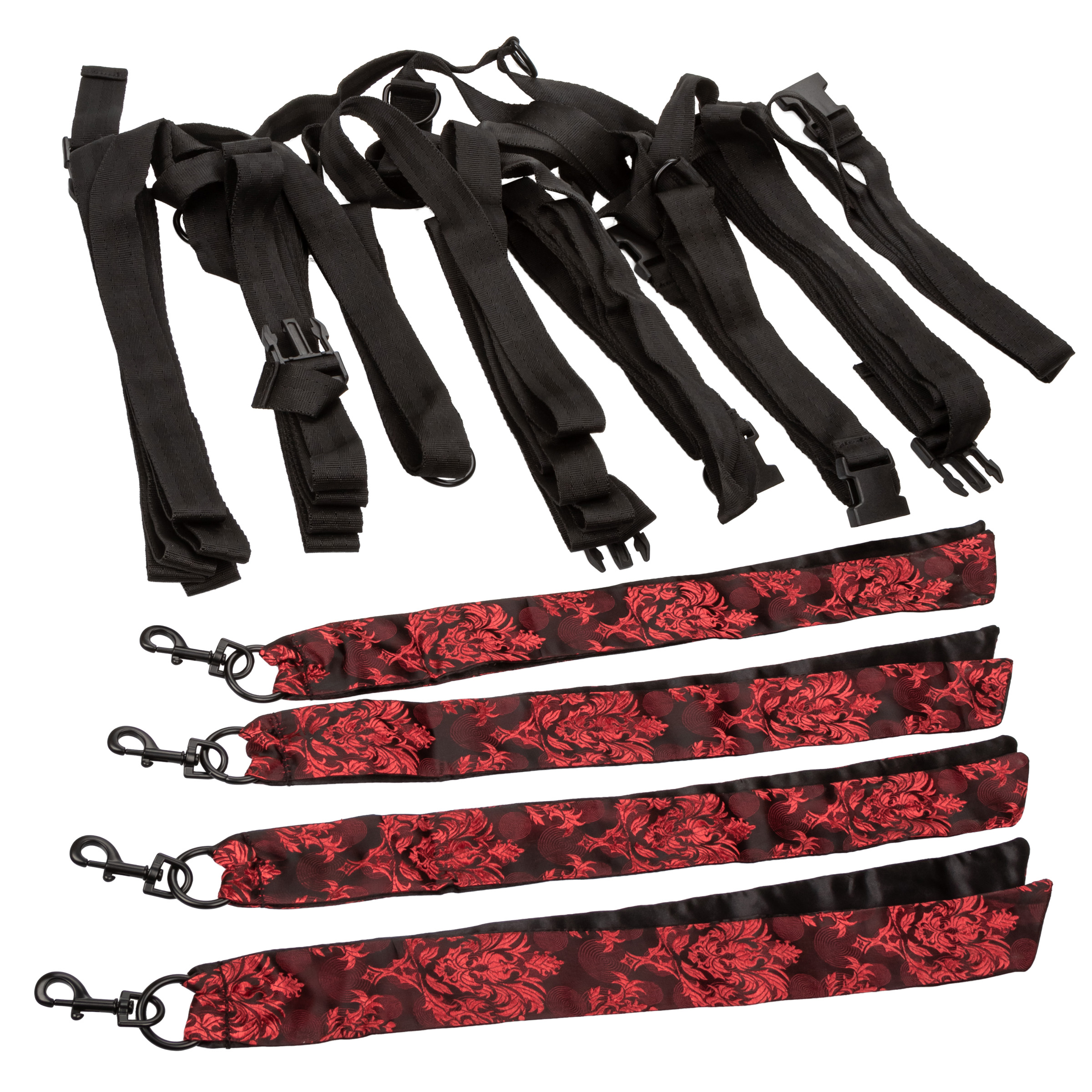 Bedroom bondage has never been easier! These 8 Points of Love fit over mattresses up to California King size and open the doors of BDSM to you and your lover. Perfect for both beginner and experienced bondage players alike, this restraint system makes it easy to spread your lover open for pleasure or punishment. These mattress straps include 8 points of connection for you to secure the included designer inspired bondage tethers – open them for punishment, pleasure, or both! Test your knott abilities with the sexy red and black tethers, and customize the tightness of the silky smooth cuffs. The swivel clasps and easy to use design of this package make it easy to change positions on the fly and find what works for you – experiment and play without velcro or metal buckles to hold you back with this bed restraint kit! Materials: Polyester, Polypropylene, Iron, phthalate free Measurements: 200 inches x 180 inch straps, 24 inch long tethers Color: Red and black