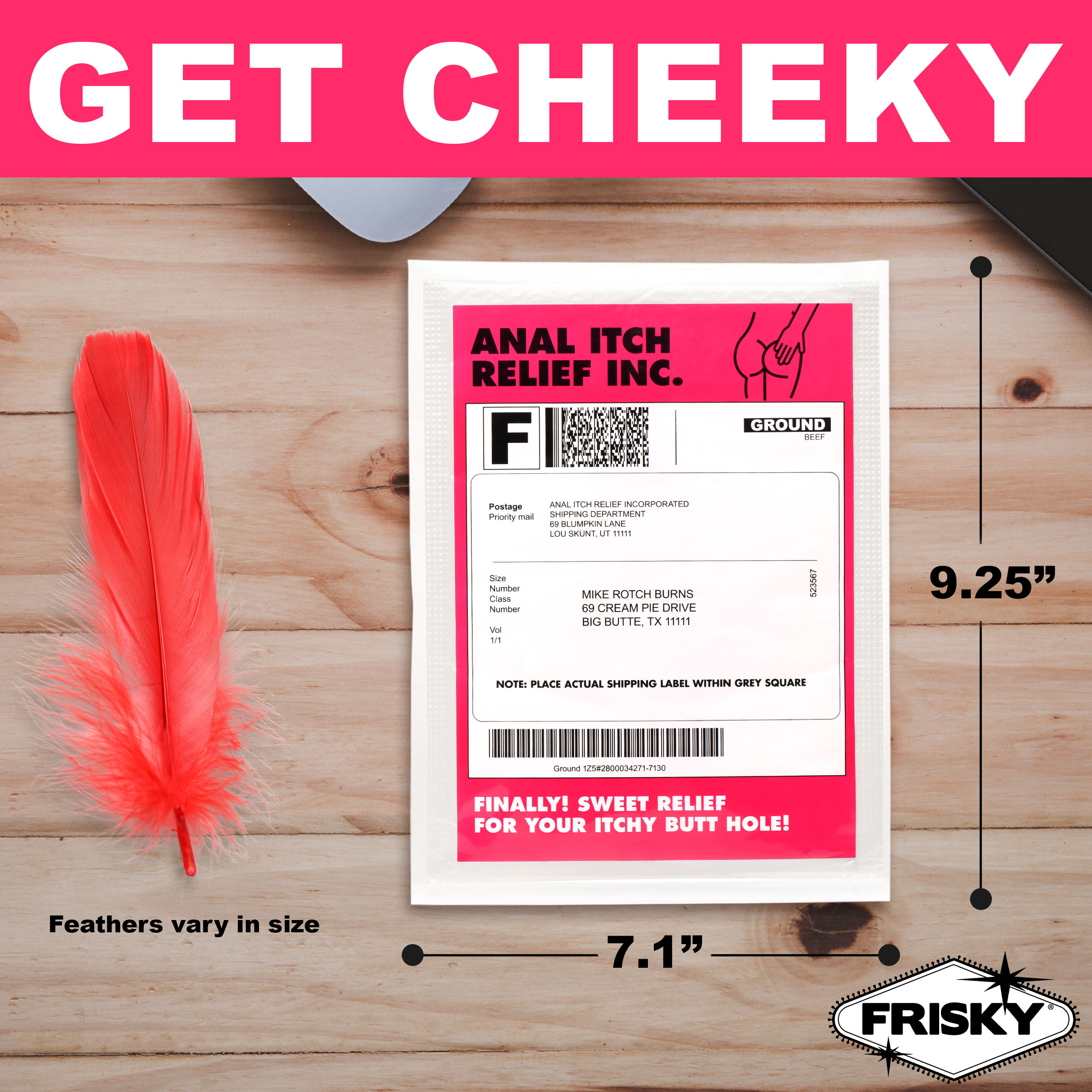 How to send help to your friend in need!Select your itchiest friend!Place the Anal Itch Relief in your cartTo mail directly to your friend order this product separately from any other itemsMultiple recipients, with different addresses, will require their own separate transaction(s)Use the recipient's address under the shipping address.Use your address under the billing addressIt makes a great gag gift on a birthday or for a bachelor party! Great for friends, family, and frenemies! This synthetic red feather comes in a bubble mailer package with the feather and instructions enclosed and large writing on the front of the package that will have the mailman laughing, too!