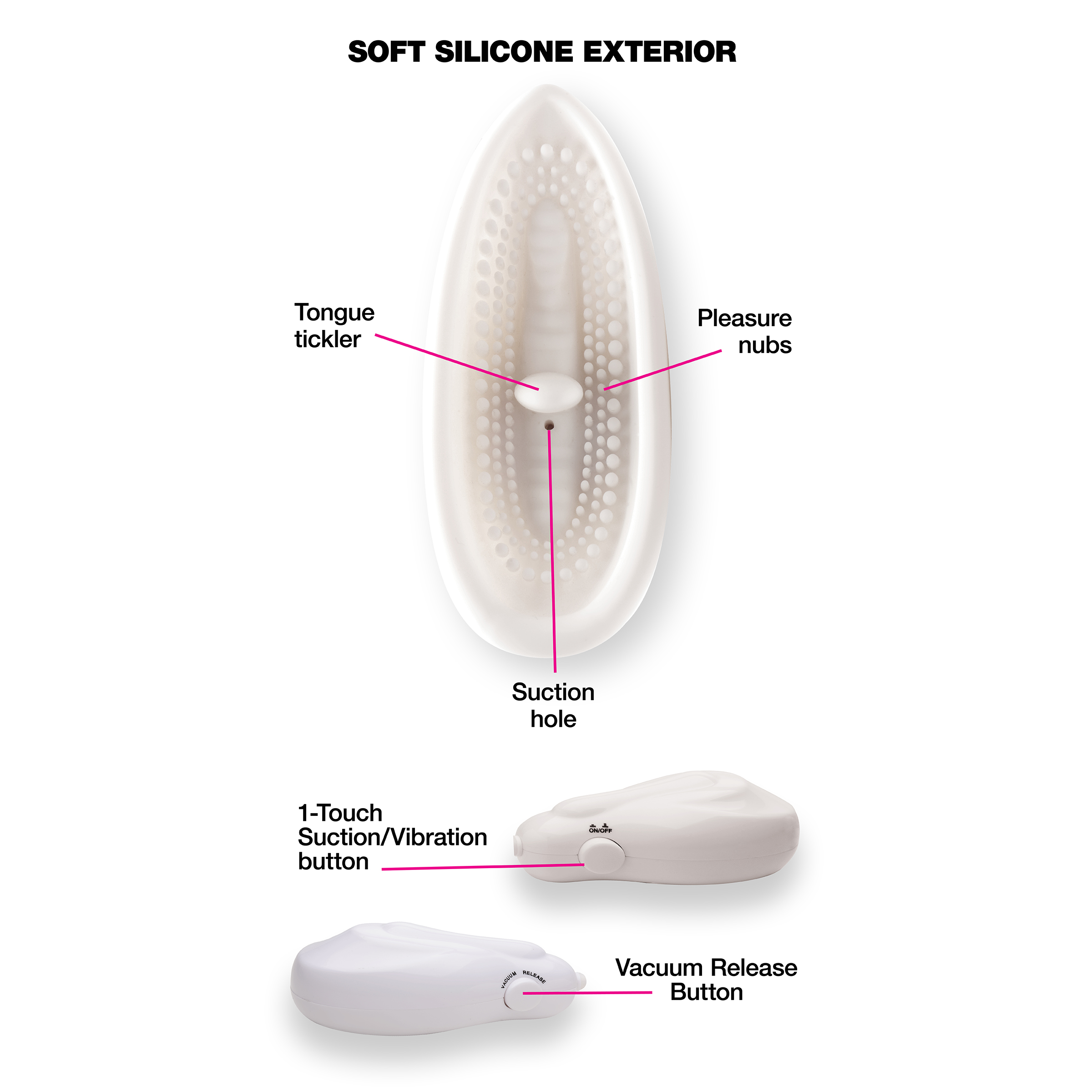 Suction your sensitive vulva into texture and vibration! Place the silicone cup against your labia and clitoris and use the automatic pump to turn on the vacuum and vibration. Soft tendrils will massage your most delicate parts while a small tongue laps up your sweetness. The pressure will also draw more blood to the area, making you more sensitive. The on-off button is easy to use, while a vacuum release button with quickly free you from the euphoria within the cup. The premium silicone material is non-porous and phthalate-free, but not compatible with silicone lubricants. Clean with mild soap and warm water.