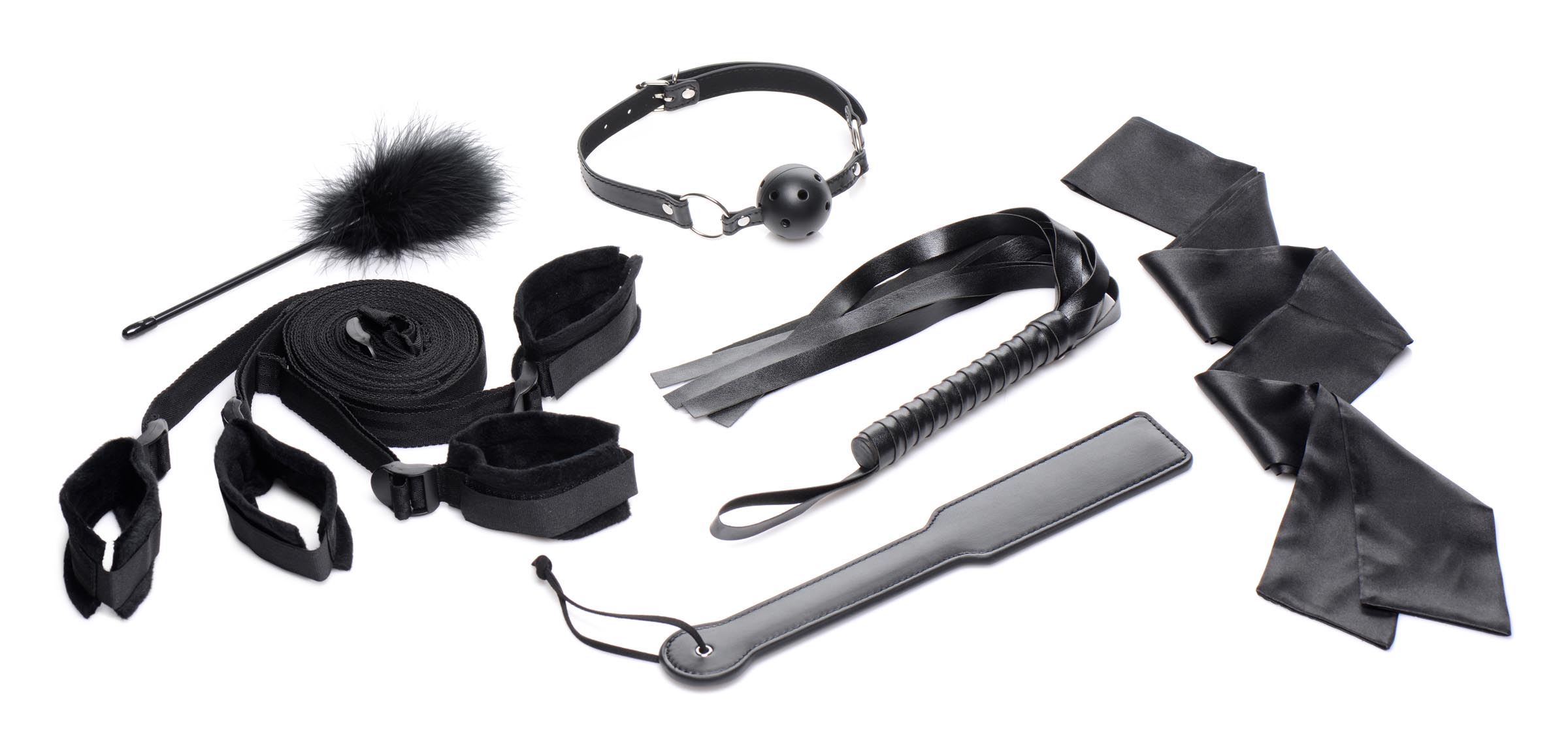 Everything you need for a fulfilling BDSM scene is included in this bondage kit! The under-the-mattress bed restraints holds your partners body open so you can punish and please their body with the included paddle, flogger, or tickler. Explore the world of bondage at your own pace and use each accesorry as you see fit!