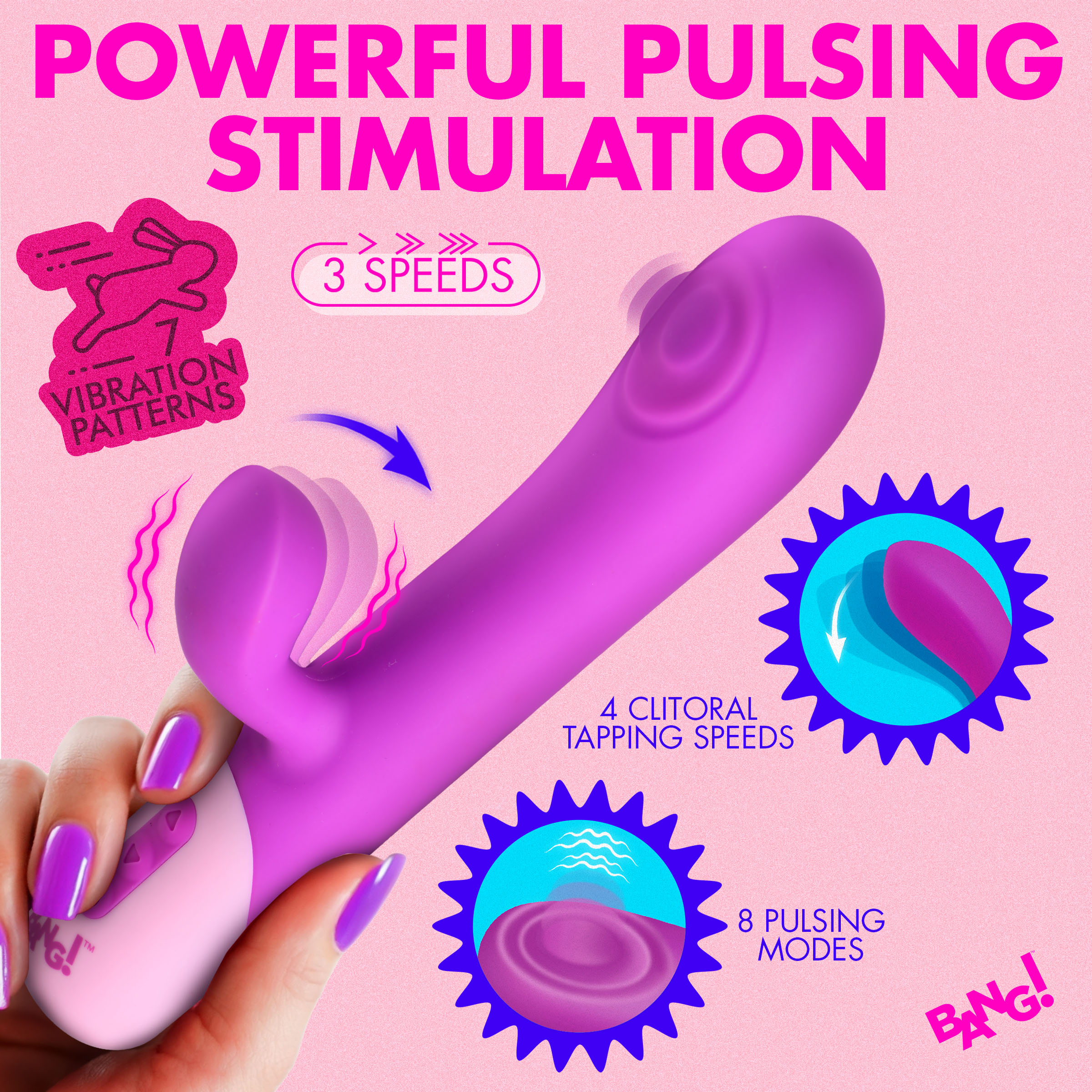 Elevate your pleasure with this innovative rabbit vibrator designed to deliver unforgettable sensations. Its round-ended shaft is crafted to pulse directly on your G-spot with 8 customizable pulsing modes, offering you precision and variety. Pair that with the magic of clitoral tapping and vibration, combining 3 speeds, 7 tantalizing patterns, and 4 tapping modes to ignite every inch of your passion. Made from body-safe, premium silicone, it feels irresistibly soft and silky against your skin. With an IPX5 splashproof rating and a USB rechargeable design, this sleek device blends functionality with luxurious performance. Perfectly crafted for an exhilarating and smooth experience. Measurements: Overall length: 8.4 inches Insertable length: 4.8 inches Widest insertable diameter: 1.5 inches Materials: Silicone, ABS plastic Color: Pink