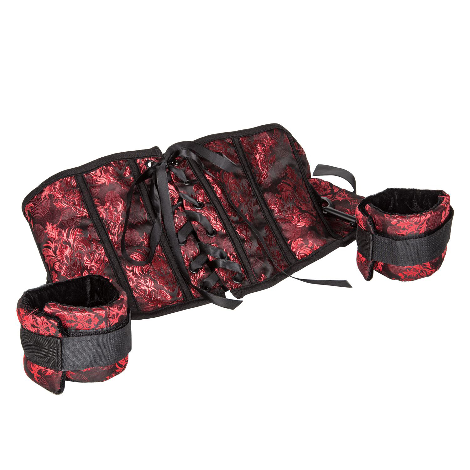 Delight your lover with the Scandal Corset with Cuffs! Your true beauty will shine in this red brocade corset and its matching cuffs – the gorgeous black lace-up closure and silky ribbon give a royal energy when worn, and the adjustable padded cuffs keep you submissive to your lover in comfort. The plushy, removable cuffs can be attached to each other in front or behind the body for all kinds of rough play!