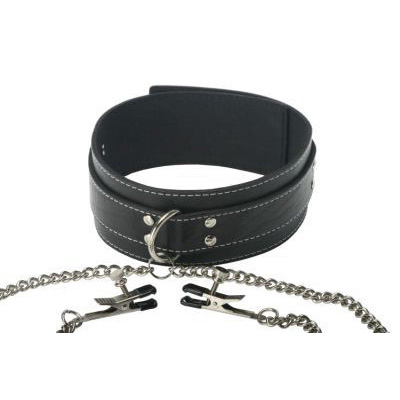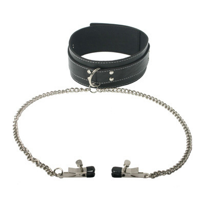 Imagine the seductive combination of PU leather and metal, collar and clamp...pleasure and pain. Master Series has your fix with the Coveted Collar and Clamp Union. This two in one set is made with submission in mind. The quality faux leather collar secures by means of a buckle and has two 12 inch chains attached to a front D-ring. Ending the chains are adjustable nipple clamps that are quickly and easily made tighter or more loose with thumb screws, so you can decide just how much punishment your naughty one requires. Measurements: Fits necks 14-18 inches Material: PU Leather, Metal Color: Black and Silver