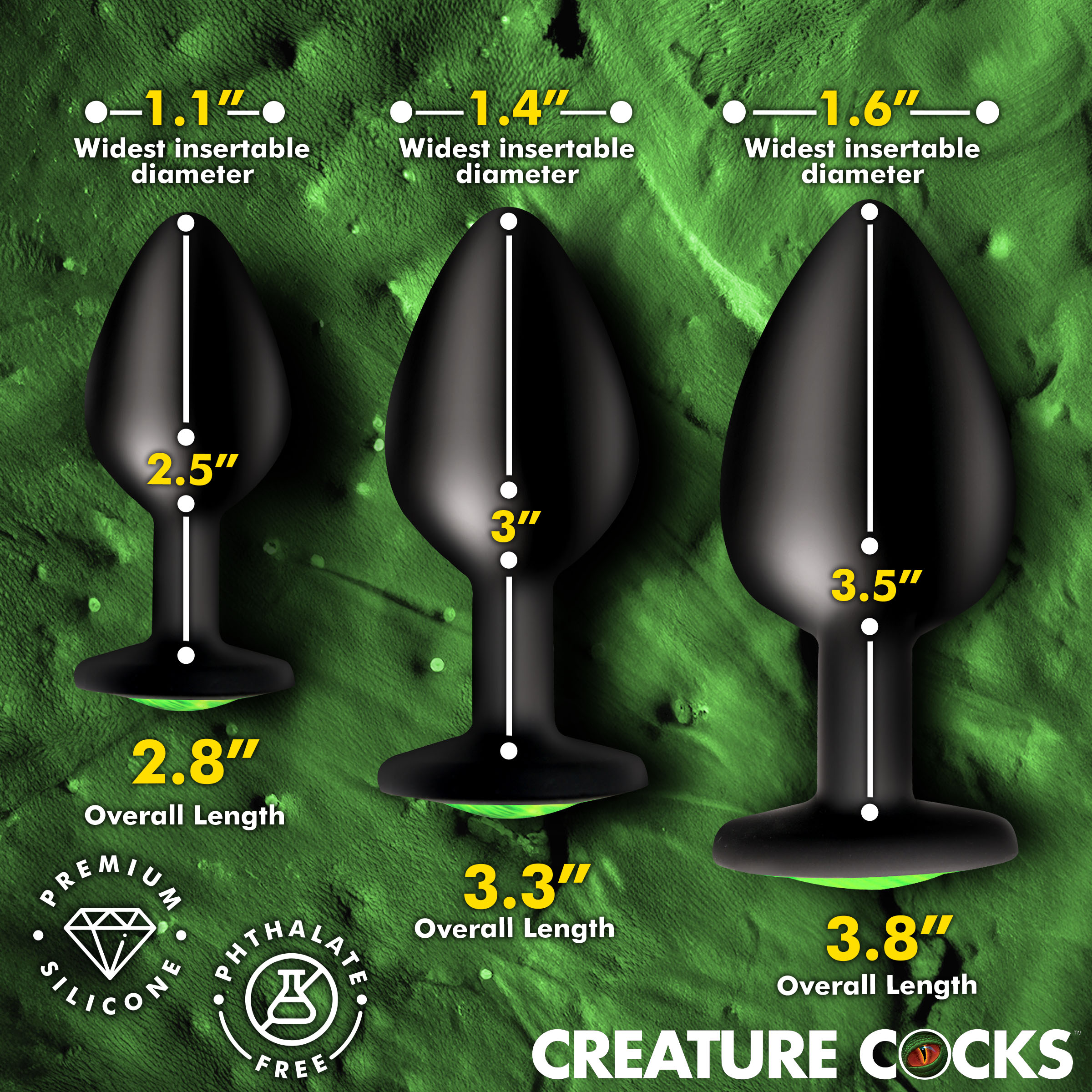 Train yourself to take in larger and larger sizes with the Creature Eye Silicone Butt Plug Set! Enjoy a small, medium, and large size that tests your limits as you train your back entry! This alluring plug features a vivid green cat-eye, making a bold statement when playing with a partner. Crafted from high-quality, body-safe silicone, it offers a smooth and delightful touch. The design includes a tapered tip for effortless insertion, paired with a slim neck and a wide base to guarantee it stays put. Elevate your intimate moments with a touch of fantasy, enjoying both comfort and a unique visual appeal that will leave your partner enchanted by your gaze! Measurements: Small: Overall length: 2.8 inches Insertable length: 2.5 inches Widest insertable diameter: 1.1 inches Medium: Overall length: 3.3 inches Insertable length: 3 inches Widest insertable diameter: 1.4 inches Large: Overall length: 3.8 inches Insertable length: 3.5 inches Widest insertable diameter: 1.6 inches Materials: Silicone, glass Color: Green, black Note: Use only with water-based lubricants.