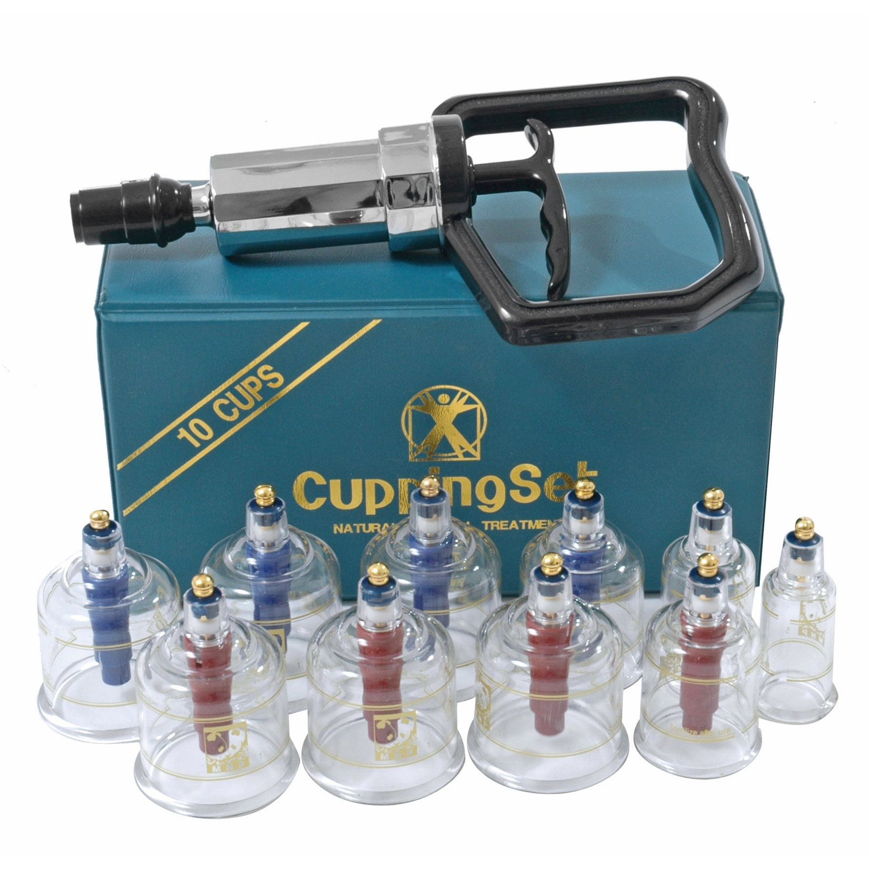 Cupping Kits are based on the oriental method of using suction to pull impurities of the body through the surface of the skin. In Fetish play cupping kits are superbly diverse They can be used on many areas of the body, such as breast, nipples, penis, and ass. The cup suction leaves a temporary mark on the spot it was attached. Vacuum cups are easy to use, simply attach the cup to the hand pump, hold the cup over the desired area (or body part!), pump and let go The cup will stay stuck by the skin being sucked into the cup Specifications: You" ll receive 10 cups of various sizes and a suction gun that attaches to each cup. Place the cup over your hot spot and gently pull back on the trigger. There are 8 removable spring-loaded acu-points that are centered within the cups for additional stimulation. Note: We strongly recommend careful use of this cupping kit. When used properly, you can achieve stimulating pleasure. However, excessive and over-eager suction can cause damage to the blood vessels resulting in bruising. We suggest that this item be used on moistened skin.