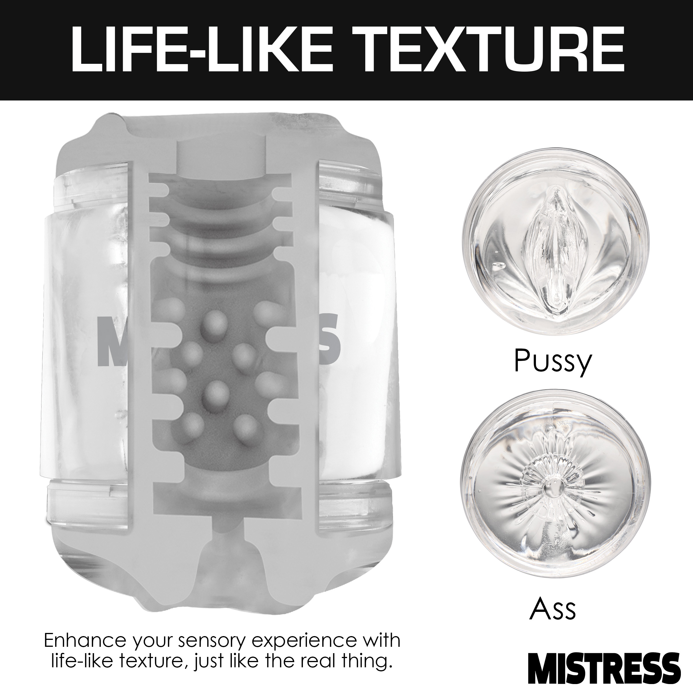 See-Through Design: This clear Mistress stroker lets you see your rod through the tunnel! Soft and Stretchy: Made out of phthalate-free, latex-free, body-safe TPE. Enjoy the stretchy, soft material!Textured Inner Tunnel: The ridges and nubs inside grip and stroke at your shaft with each stroke. Open-Ended: Enjoy either a pussy or ass entry and an open ended exit for either side which makes clean up easy!