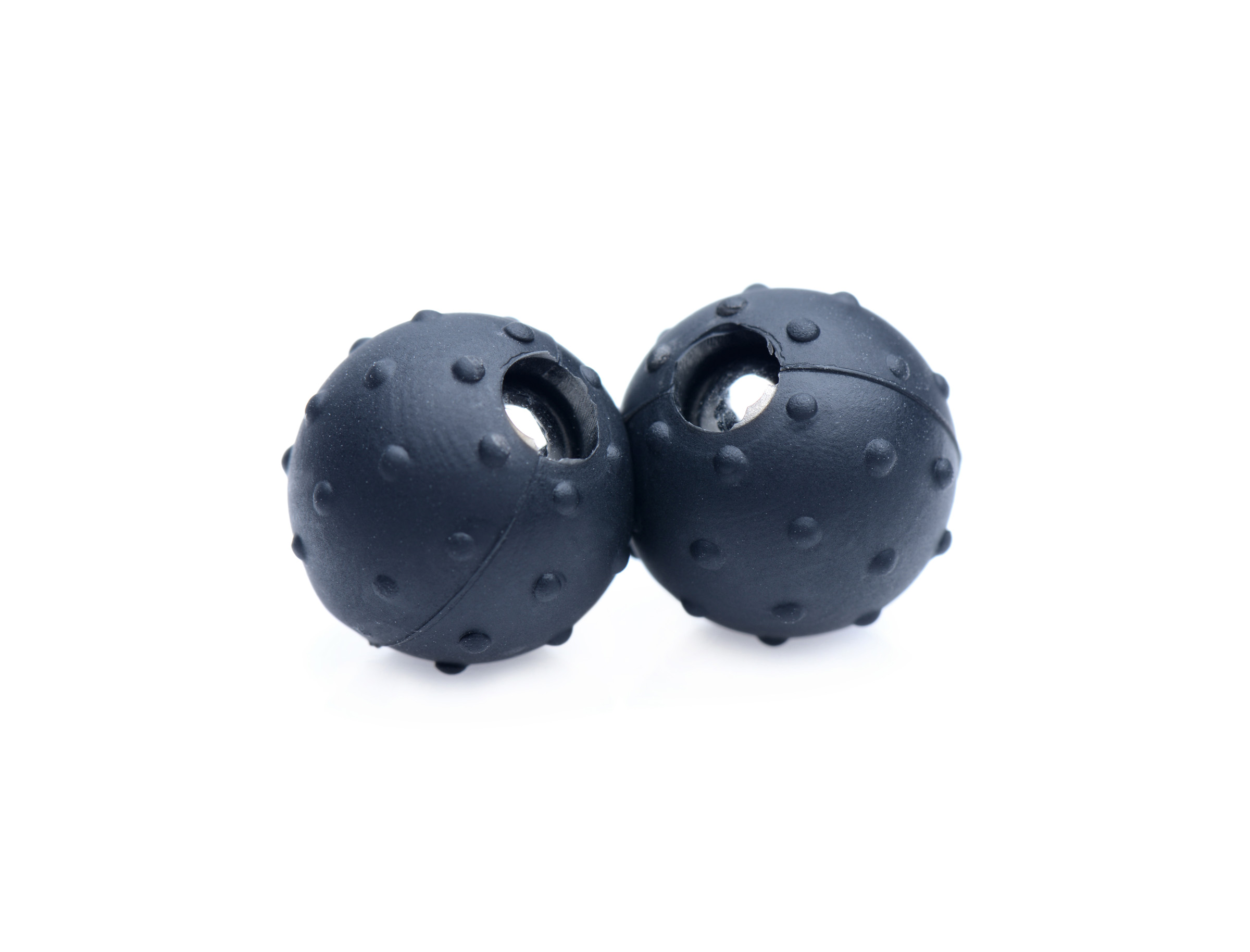 These textured magnetic spheres will give you a pinch of pleasure This set comes with two silicone-coated orbs that may appear small, but pack some serious pressure. Once placed on sensitive flesh, the magnets begin to yearn for their partner. The soft, phthalate-free silicone coating decreases the intensity of the pinch while still maintaining the strength, but they can be used without the covers for an extra bite. Make a game of seeing how long they can keep this pinching pair in place. As your plaything relaxes, the pressure will continue to give them what they have been craving. Measurements: .45 inches in diameter Material: Neodymium magnet and silicone Color: Black Note: Includes 2 spheres