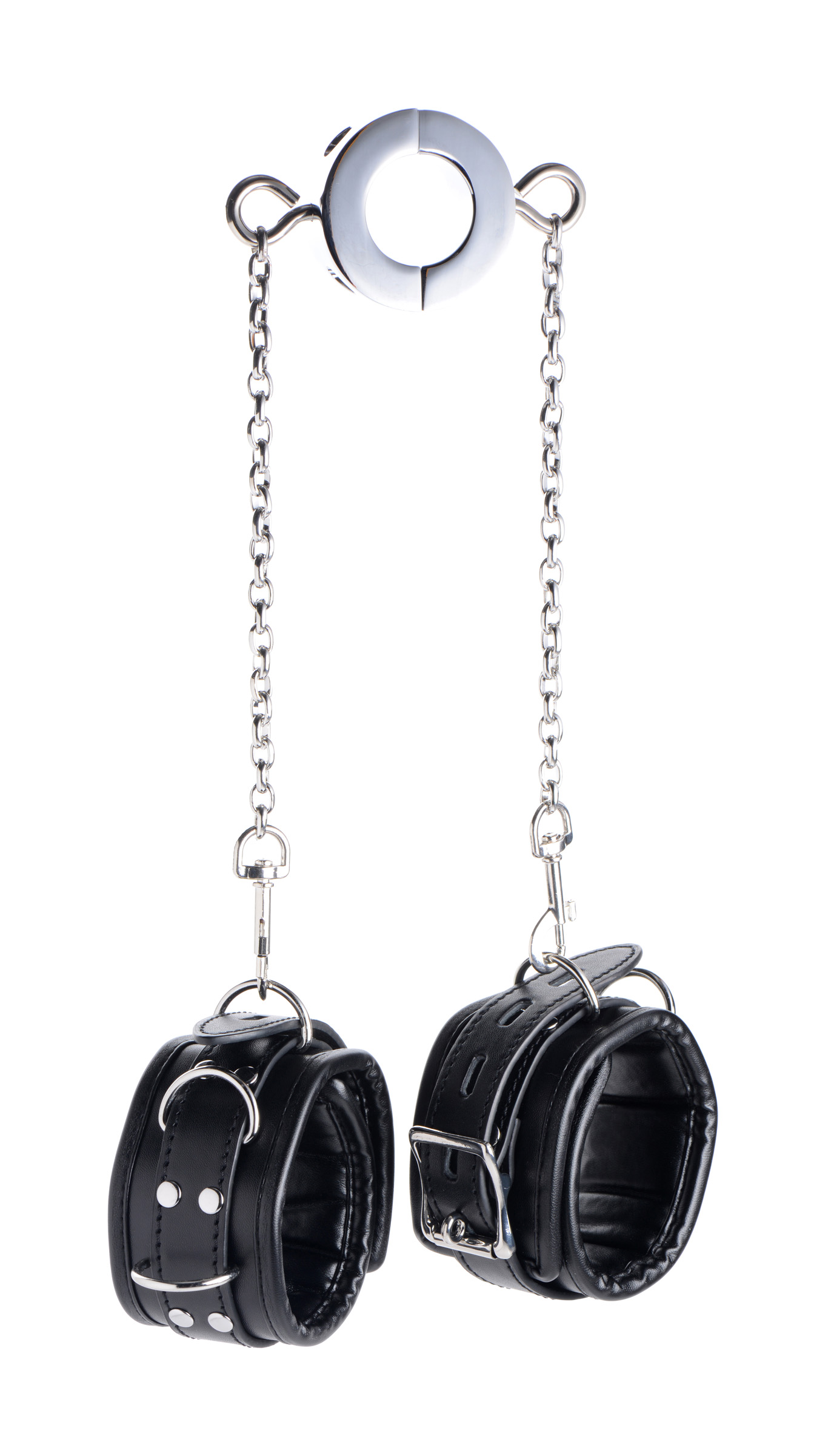 The ankle cuffs can be adjusted to find the perfect fit and feature three D-ring attachment points to fasten your choice of restraints to lock them down further! The ankle cuffs feature locking buckles if you choose to add your favorite padlock into the mix. The Ball stretcher ring features additional attachment points for more weights or more restraints - experiment with your lover and see how far you can stretch their limits!