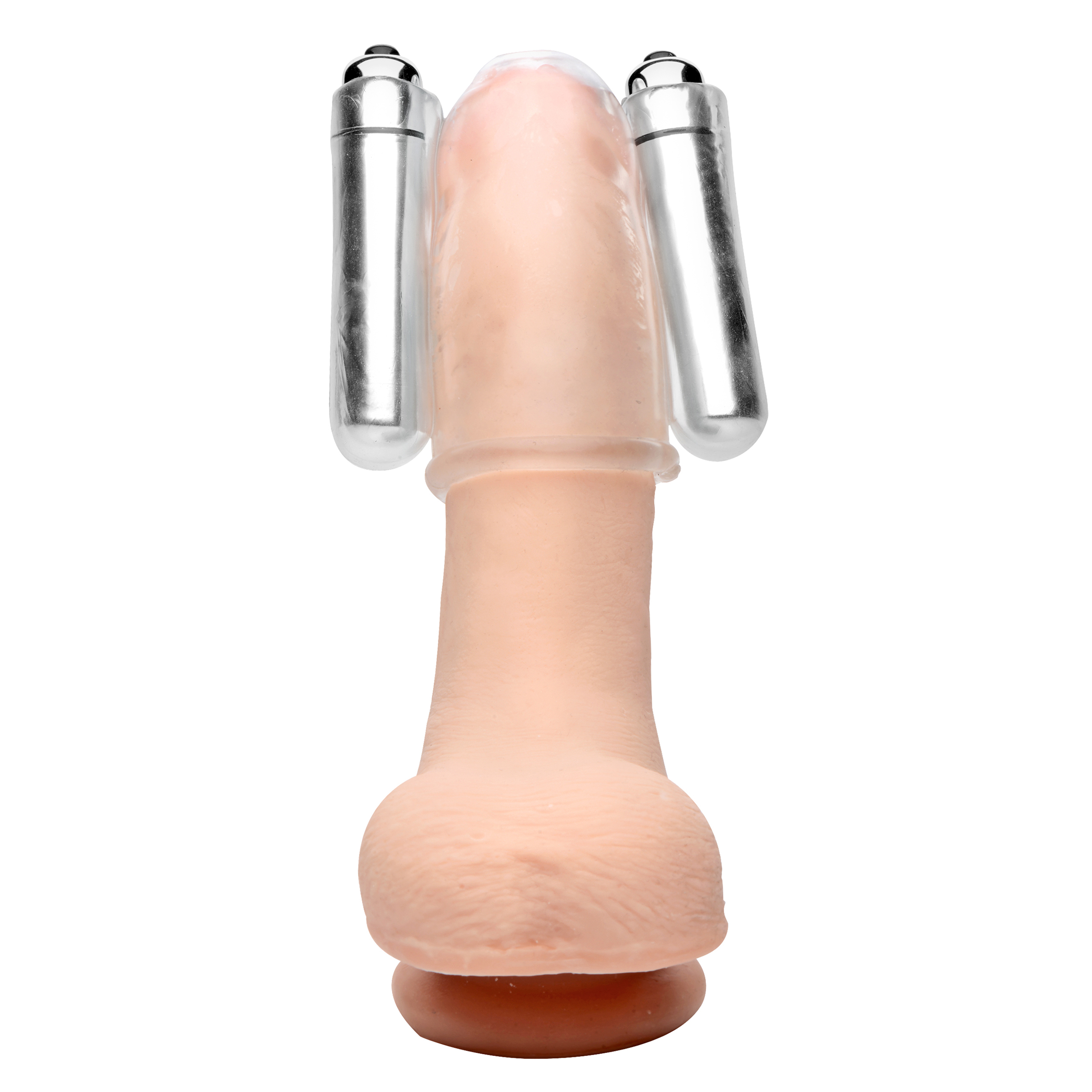 This clear sheath allows you to watch your penis head thrum! With super-powered twin vibrating bullets and a super-stretchy, head-encompassing sleeve, you can experience targeted stimulation on one of the most sensitive areas of your body! Two ultra powerful wireless bullets help surround the tip of your cock in toe-curling pleasure. Designed to fit most any size, the slick material helps keep the bullets firmly against your helmet, while transmitting the vibration to every part of your cock head. A cum-through hole allows for the ultimate orgasm. Just slip it on and go!
