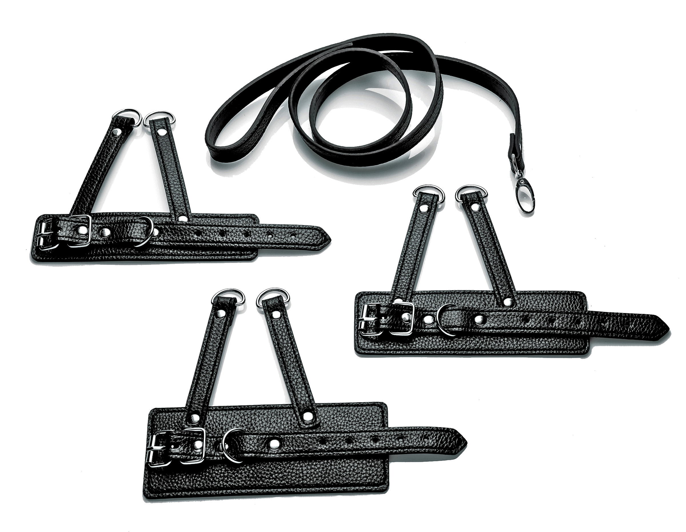This 4 piece set includes 3 adjustable scrotum harnesses, made of an easy to clean and durable PU leather material. The leash has a simple snap hook closure with wrist loop and plenty of length to control or lead your subject. You can even attach weights, ropes, or other accessories as you desire. The metal is nickel-free to prevent irritation and the material wipes clean easily.