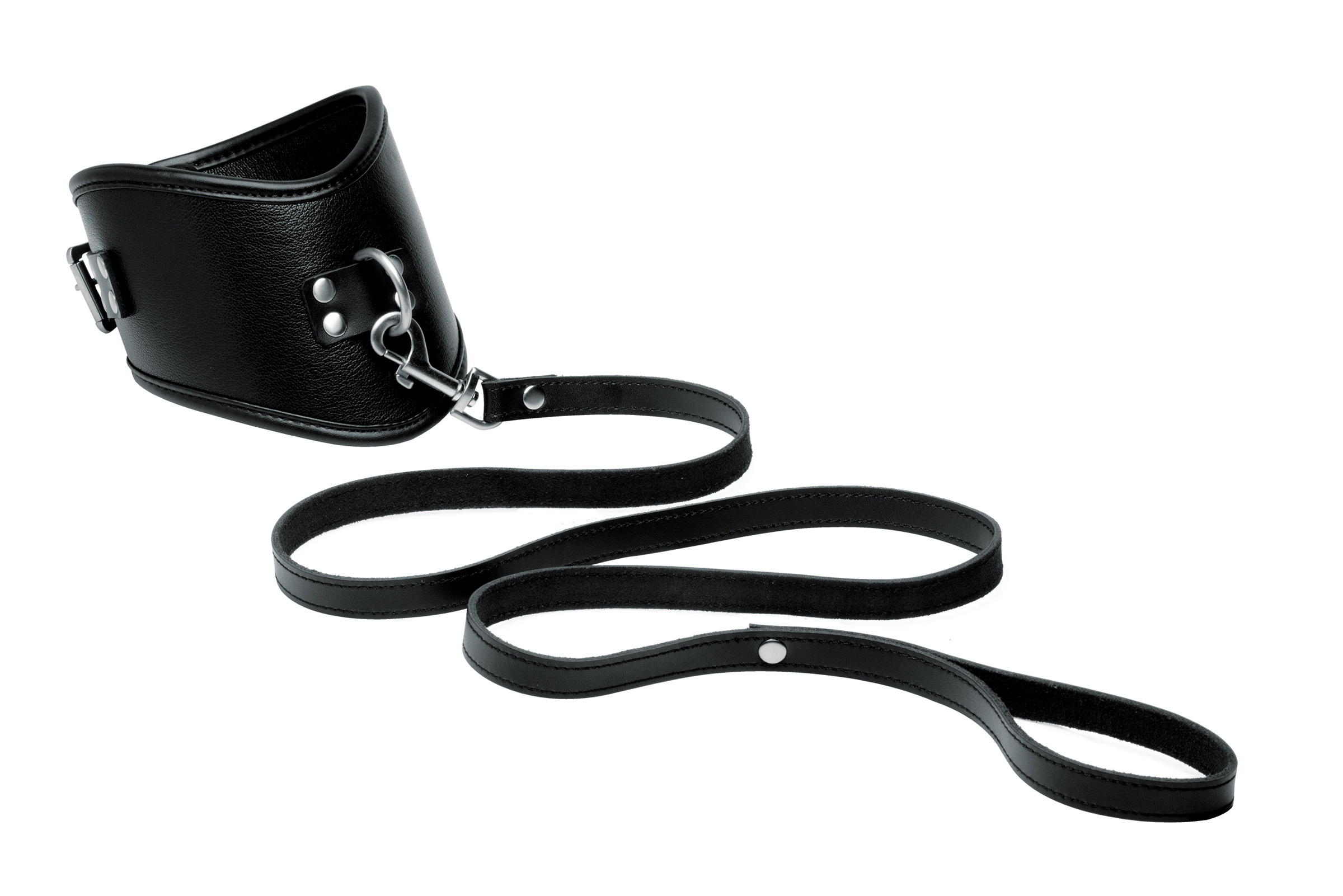Durable and elegant, this fine leather collar will keep them in their place. The D-ring front allows you to attach leashes, ropes, or accessories for plenty of bondage options. The silver toned hardware is nickel free, with an optional locking buckle at the back for adjustment and security. The leash has a snap hook and wrist loop, plus plenty of length to lead and control them.