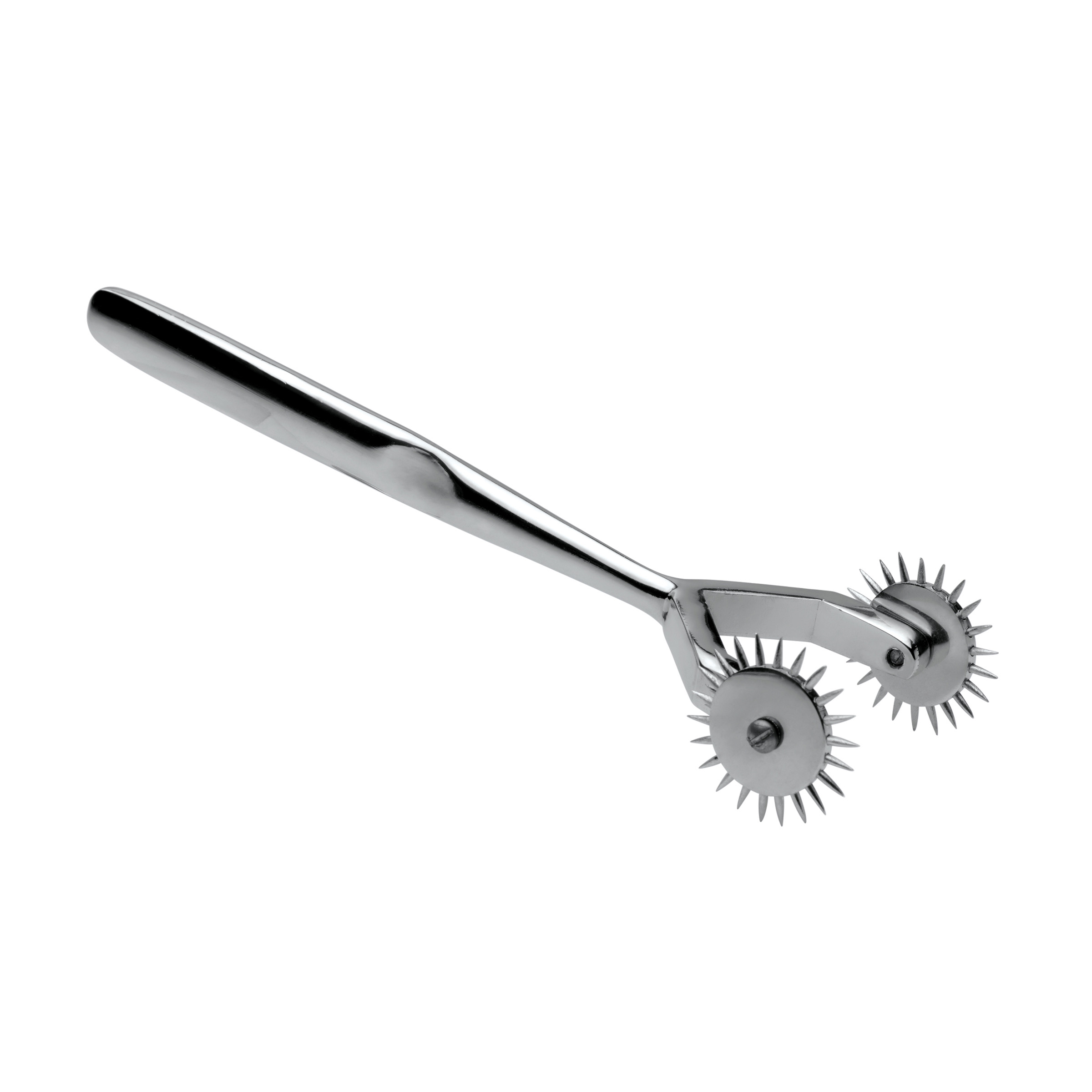 This attractive and exciting take on a Wartenberg Wheel is made of heavy-duty stainless steel, with two spinning heads to tease and please your lover with. The handle is slightly indented on either side for a comfortable and secure grip between your fingers during use. Glide the instrument across your partners chest or up their thigh to send shivers through their whole body. The wheels spin smoothly, sharp pin-pricks leaving a trail of sensation in their wake.