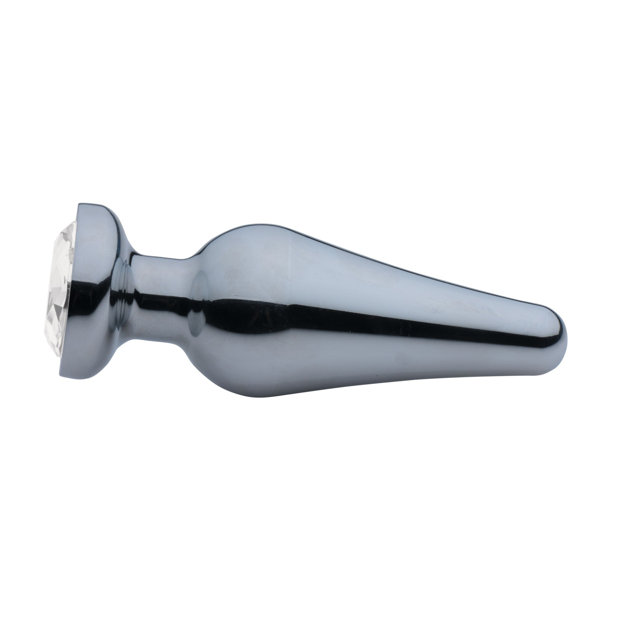 Adorn yourself, or your lover, in a sexy and heavy anal plug that will make their booty shine This slick metal plug is beautifully bejeweled for the ultimate aesthetic. Every time you bend over, your lover will be treated to the incredible seduction of your sparkling ass. Heavily weighted for enhanced stimulation, you will feel fuller than ever before with the erotic sensations of this ultra-smooth plug The tapered tip makes it easy to insert, and the flared base keeps it place and allows for easy retrieval. Phthalate-free and non-porous, this gorgeous metal anal toy is completely body safe and easy to sanitize Measurements: 5.25 inches in total length, 4.5 inches insertable, 1.75 inches at largest diameter. Material: Aluminum, ABS. Color: Grey.