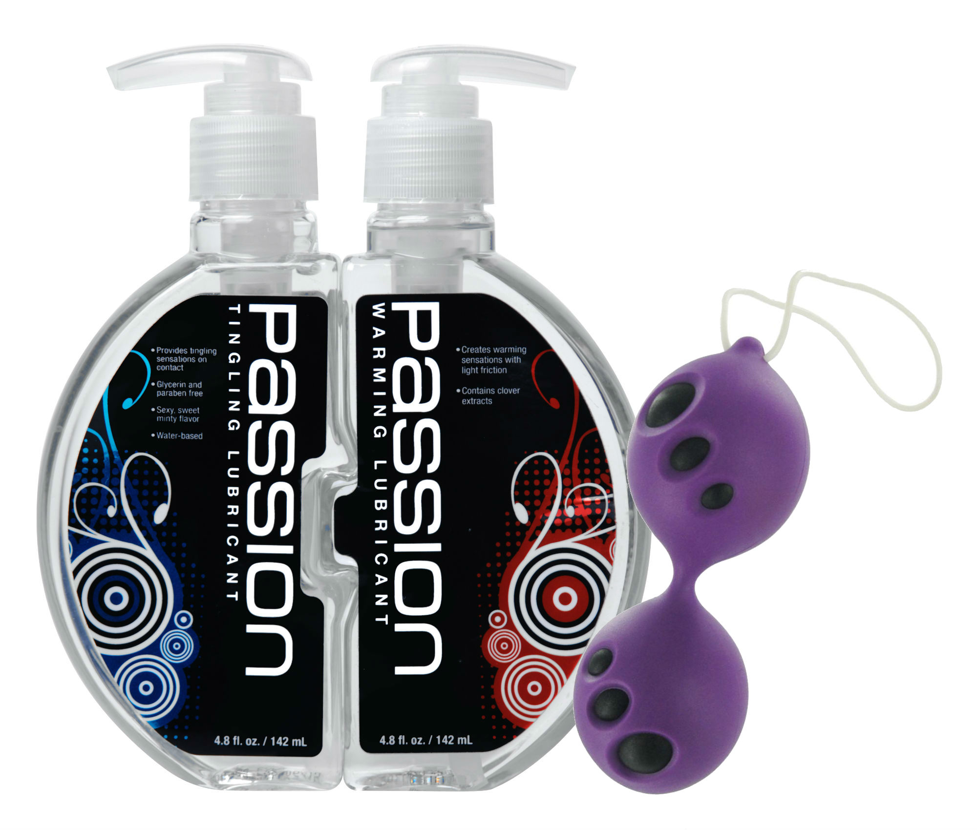 This exciting kit allows her to experience heightened arousal with an instant rush of sensation, for a more satisfying love life. The smooth, body safe silicone balls are double walled and internally weighted. With each movement, the inner ball rolls around inside the outer ball, creating a mild sensation of vibration that is completely discreet. The balls can be used all day as an arousal aide, or used as an accessory to your Kegel exercises. Kegels will help tighten the vagina, increase arousal, and lead to deeper, more frequent orgasms. The exciting lube 2 pack allows you to experiment between warming and cooling sensations. Whatever way you choose to play, this thrilling kit will have her begging for more. Measurements: Lube: 4.8 fl oz cooling lube, 4.8 fl oz warming lube; Kegel balls: 4.13 inch overall length, each ball is 1.75 inches long and 1.6 inches in diameter. Material: Silicone, ABS plastic. Color: Purple. Note: Kit comes with (1) 9.6 ounce lube duo and (1) set of Kegel balls