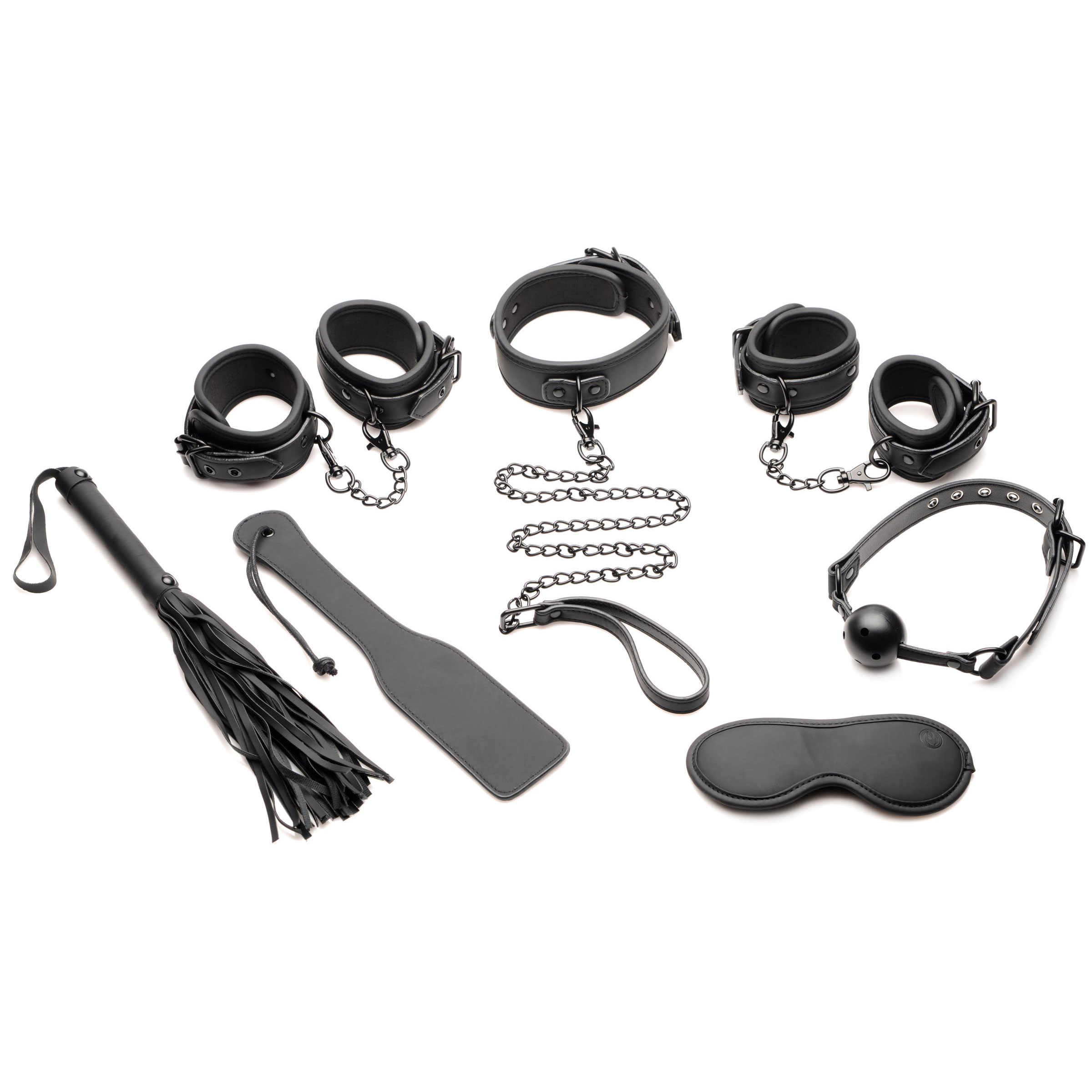 Take your relationship to the next level with this 10 Piece Bondage Set! The set includes wrist cuffs, ankle cuffs and a collar. Enjoy attaching the nickel-free, metal chains to each of the cuffs to bind them, and then attach the metal chain leash to their collar to lead them around! The straps on all of the cuffs and the collar are made of vegan-friendly, comfortable PU leather and are easy to adjust using the buckle closure. Add some more fun into your evening with more goodies included! This kit also introduces you to sensation play and light impact play! Enjoy trying out the flogger or paddle on their backside or lightly against their chest while they are blindfolded and gagged. Use the blindfold to enhance their sensitivity and awareness to touch. Use mouth gag has holes in it to improve breathability and can also enhance your sexual experience!