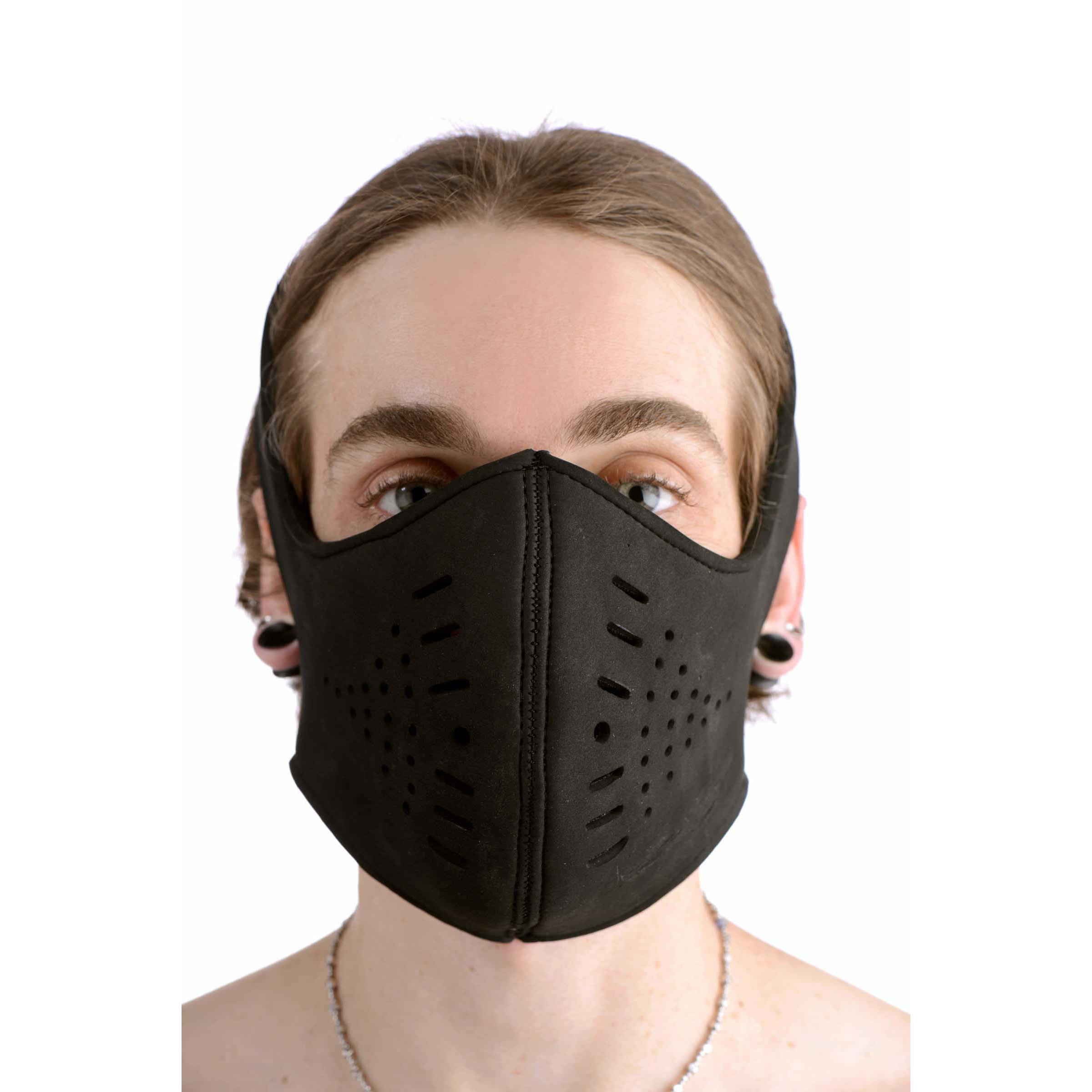This neoprene muzzle will surround the head of your sub and help remind them that they are yours to control. The perforated front allows them to breathe, while the soft, pliable material covers their lips and jaw. The snaps at the back allow you to quickly and easily adjust the size, for a secure fit on practically any size. Measurements: Top strap adjusts from 21 to 28 inches in circumference, bottom strap adjusts from 16 to 20 inches in circumference. Material: Neoprene, metal. Color: Black