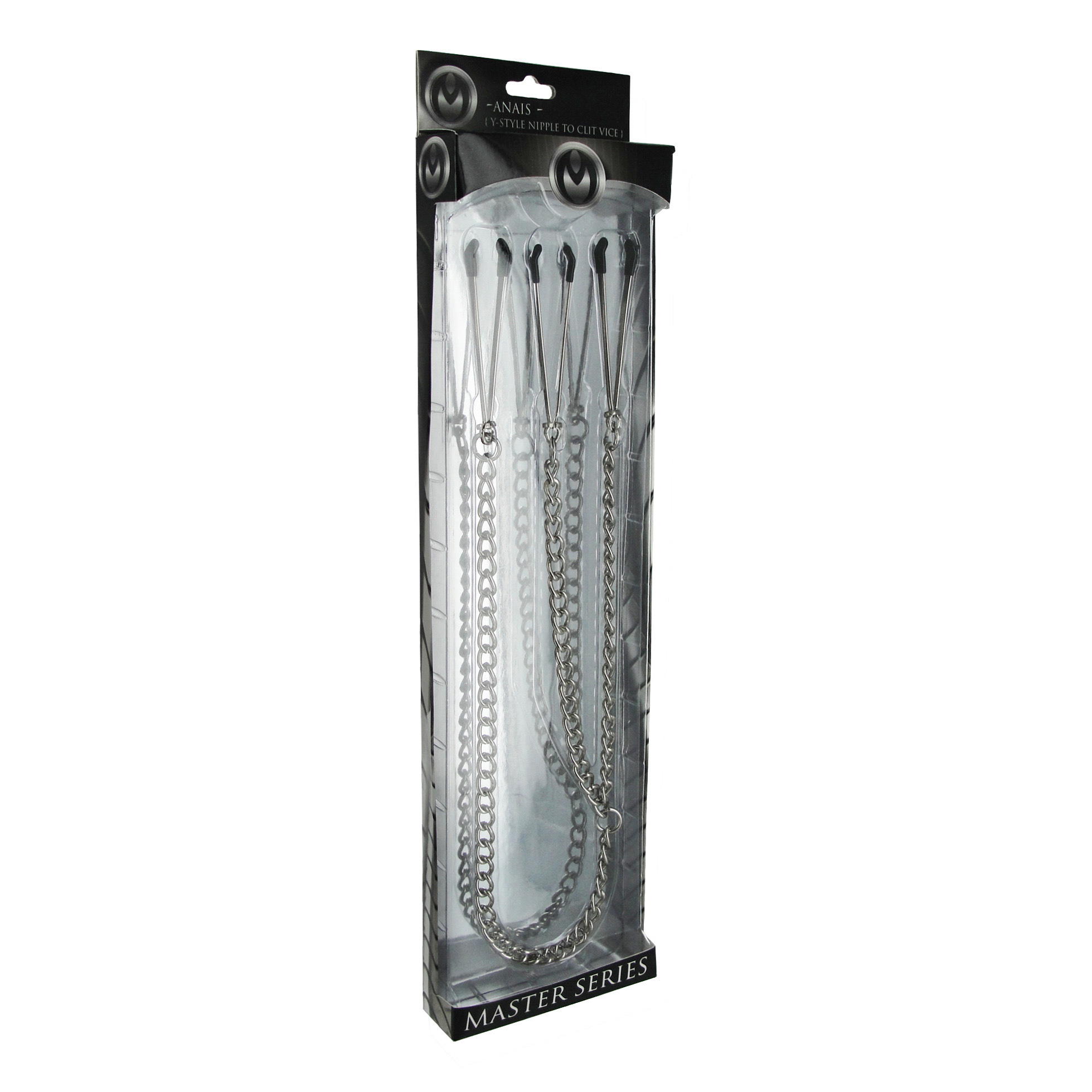 Connect her most sensitive areas together. These clamps have vinyl-coated ends, linked chain, and a sliding ring to adjust the tightness anywhere from just enough to hold them on all the way up to a really severe tit torturing pinch. They stay on, they are easy to use, they look good, and they can be heavy or light or anywhere in between.