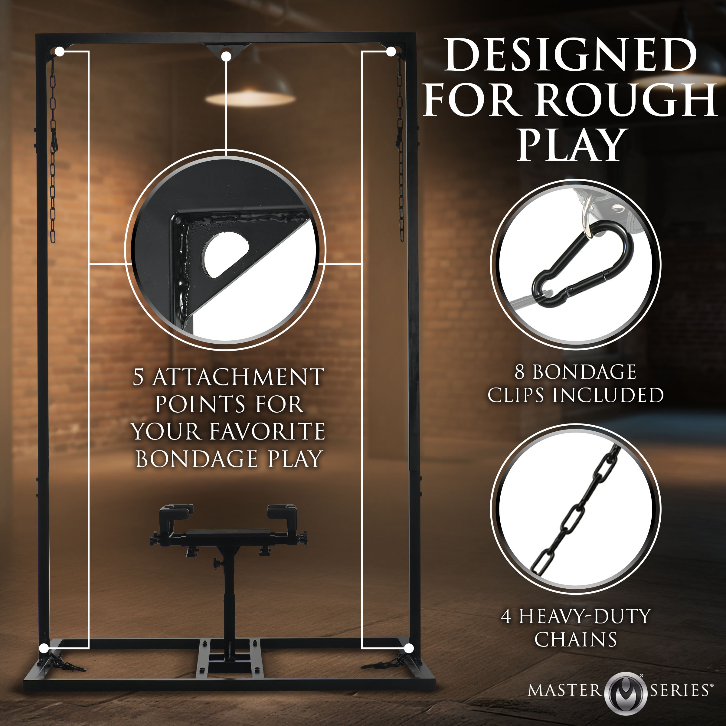 Designed for adventurous users, this sturdy adjustable frame allows standing or elevated positions while using a sex saddle without the need to kneel or bend low. Bring your submissive up to your level and please, punish, tease and tantalize them all while they are restrained by cuffs and chains to the frame! Built with a heavy-duty steel structure, it can handle extremely kinky sessions while offering maximum stability. Featuring 5 attachment points for wrist and ankle cuffs, along with chains and clips included, it’s perfect for fully customizable setups that give you the freedom to dominate the way you want. Lock the sex saddle in place, have them get on top, then restrain them so they can't wriggle free! They will ha to submit completely to intense, erotic scenes while you use other toys, BDSM gear, or kinky tools on them as they recieve uninterrupted pleasure. Compatible with nearly all saddle machines, this is a must-have upgrade for enhanced functionality and long-lasting use. Measurements: Overall: 79 inches x 47 inches x 42 inches Saddle stand adjusts from 14 inches x 6.7 inches up to 21.3 inches x 17.5 inches Chains are 20 inches in length Screw size: M8 x 1.25 x 10mm, Hole 4mm Materials: Steel, PVC Color: Black Note: Specifically compatible with AF127, AH057, and AH068 saddle machines. Saddle and cuffs not included.