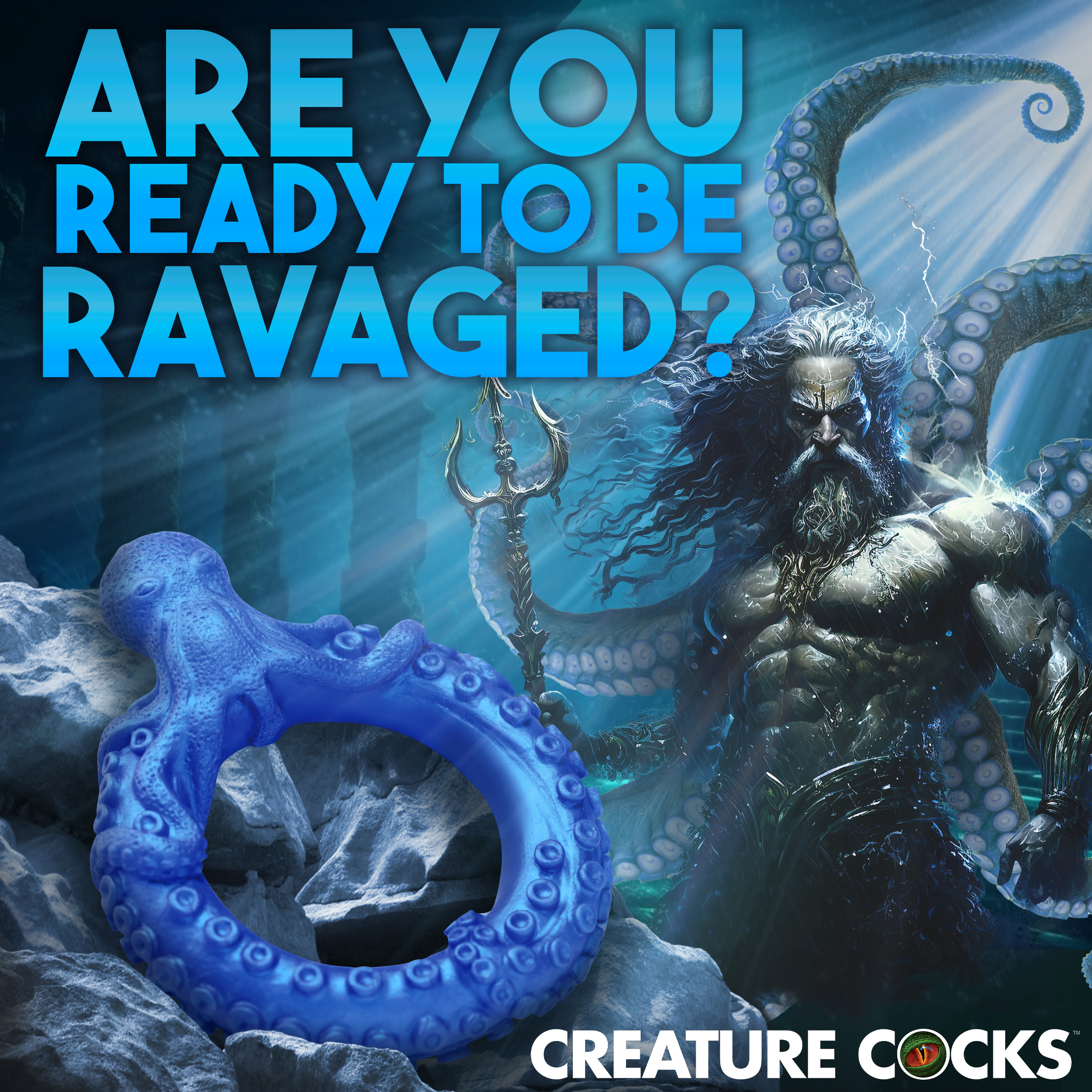 You're ready to plunge deep into your partner's depths. As you slide on this magic ring retrieved from the depths of the ocean, you know that your rod will not only be adorned with one of Poseidon's powerful totems, it will have the extra power of this tentacled creature that grips your rod and holds on while you plunge into a new kind of watery depth!