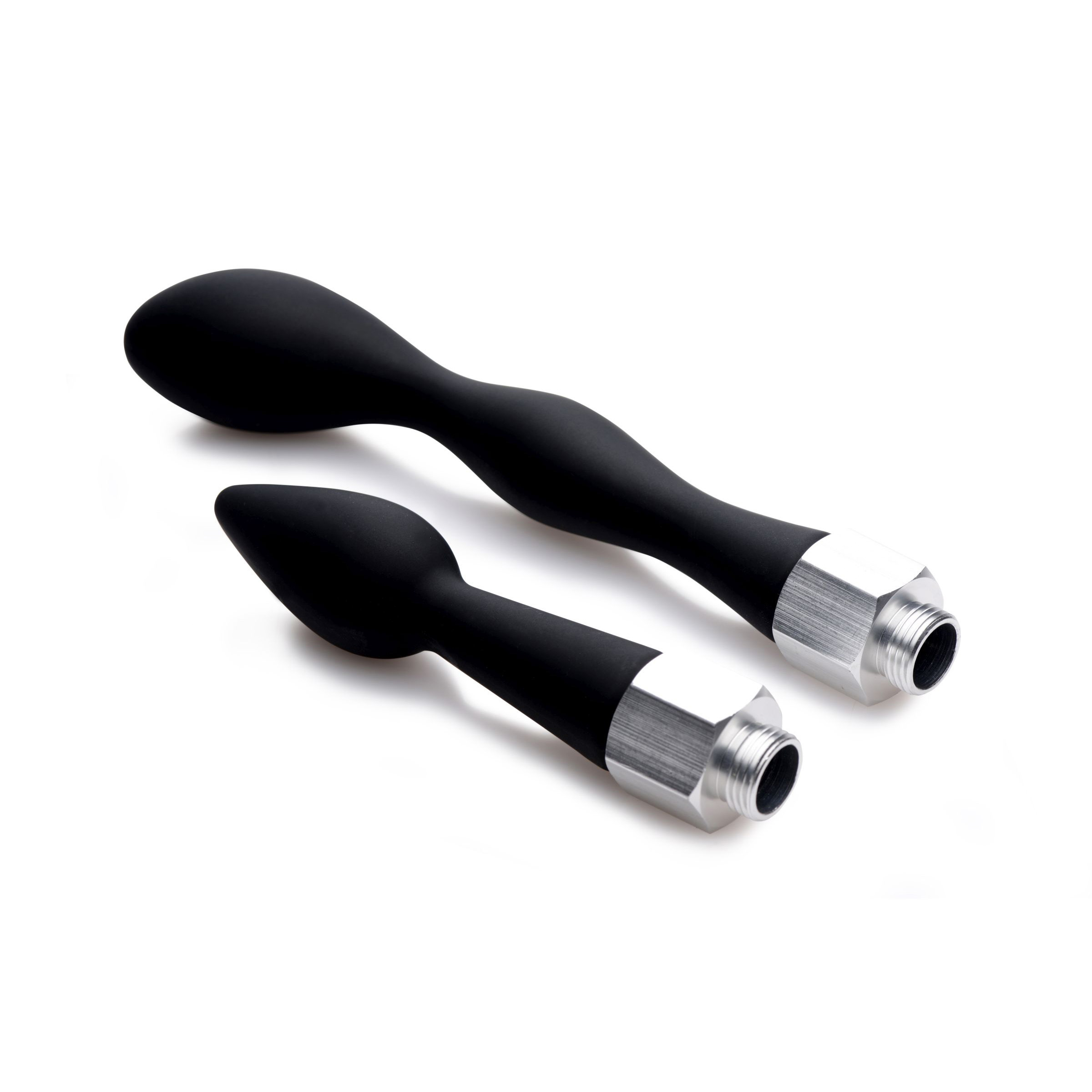 Molded of premium silicone, the lengths and shapes of these nozzle attachments offer a unique cleaning experience. Both tips include the screw-on base to attach to the hose of your enema system. The smaller nozzle is tapered to slide easily into you until the bulb is fully inserted for a comfortable penetration. The large nozzle has a curved head to provide targeted pleasure during use, with a longer shaft for deep cleaning. Both attachments are smooth, durable, and easy to grasp in the shower. Not compatible with silicone lubricant.