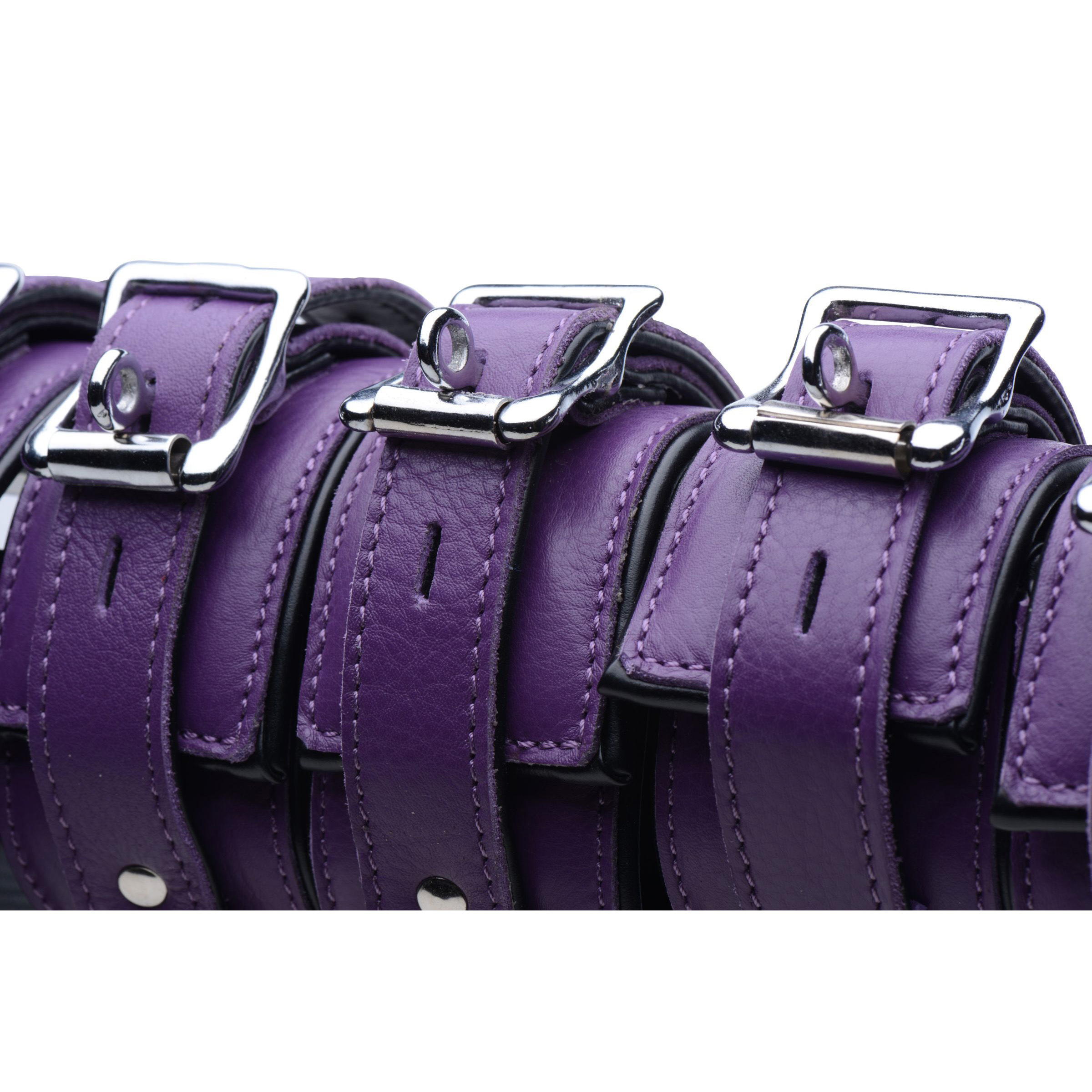 Restrain your lover in these luxurious leather cuffs and collar. This elegant set is designed to last through your most vigorous play sessions. Made of soft, comfortable leather, your play thing will not want to escape as you play with their vulnerable body. Attach chains to lock them to the bed or create handcuffs and ankle cuffs that allow them limited mobility. Each buckle closure locks to ensure that they are not set free until you are done playing with them. Enjoy an elevated play session when you adorn your submissive with this beautiful set of collar and cuffs.