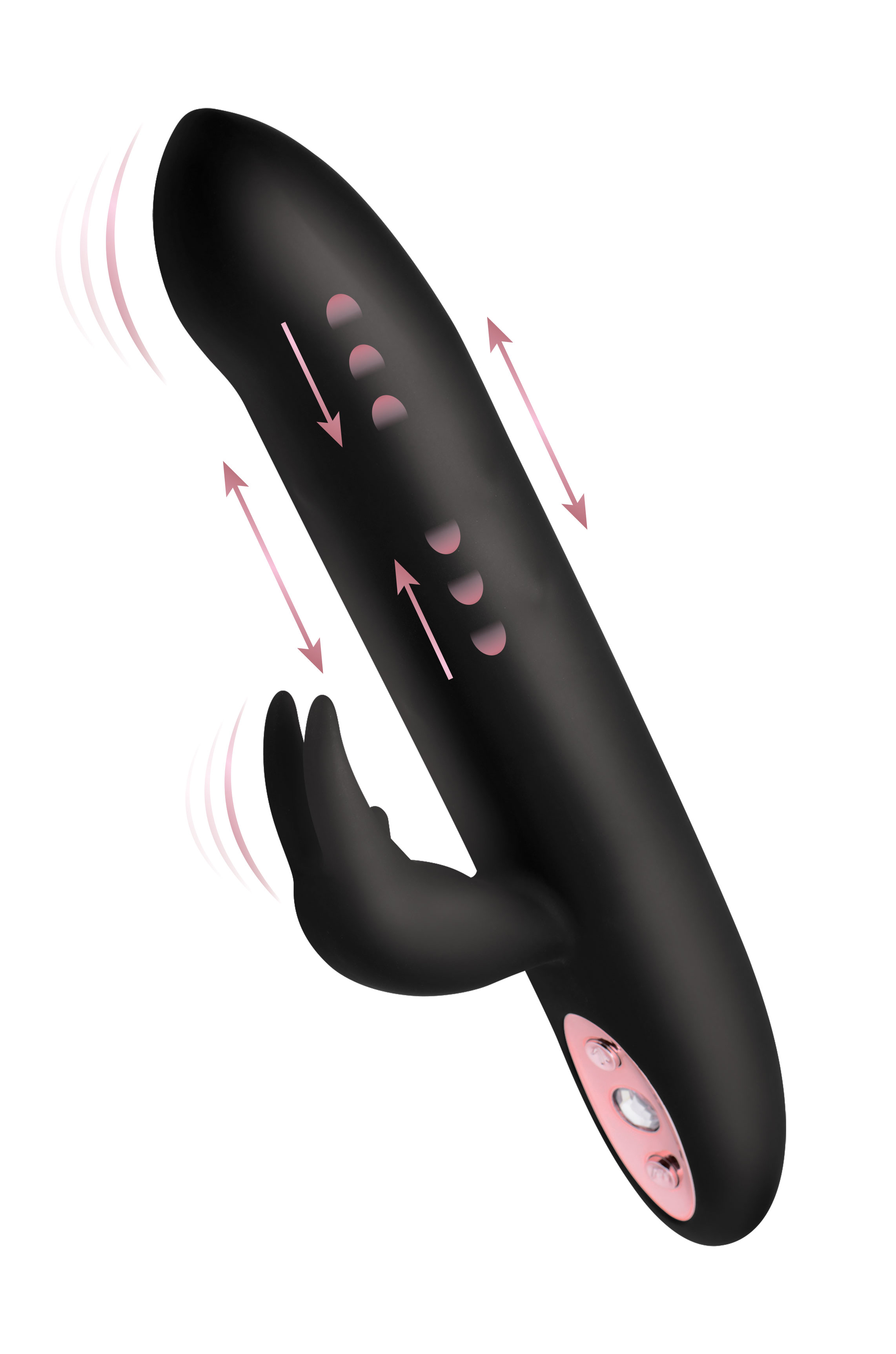Savor the sensations from a buzzing bunny and the silky-smooth shaft as two very different sensations combine for one incredible blended orgasm. This premium silicone vibrator features 3 speeds of thrumming and 7 patterns of throbbing, as well as an ample shaft that will massage you with undulating beads and 3 vibrating speeds of its own. The elegant gem-adorned control panel is simple to use. A protruding bunny nose will pinpoint your clit for vibration, while the ears will flutter around it for an entirely different sensation. This pleasure tool is magnetically rechargeable and waterproof so that you can treat yourself in the bath or shower. The phthalate-free material is non-porous for an easy clean with mild soap or toy cleaner. Avoid use with silicone lubricants. Measurements: 9.5 inches in total length, 5.8 inches insertable length, 1.6 inches at widest diameter, 1.4 inches at narrowest diameter Material: Silicone, ABS Plastic Color: Black Note: Charges via USB