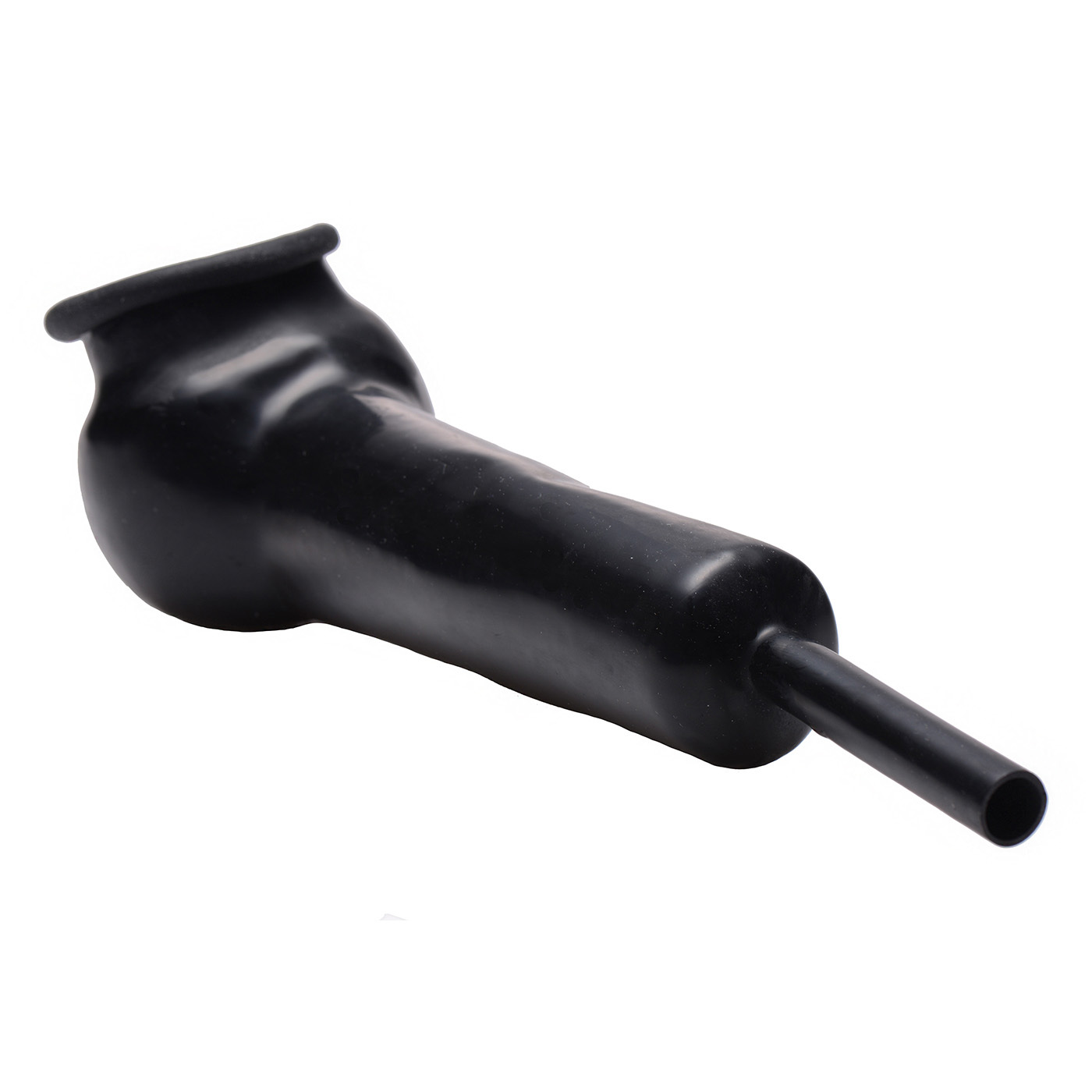 Cock and balls secure into tube completely encasing them. Narrow tube allows for urination. Rubber sheath is 7" long and the narrow rubber tube is an additional 3" in length.