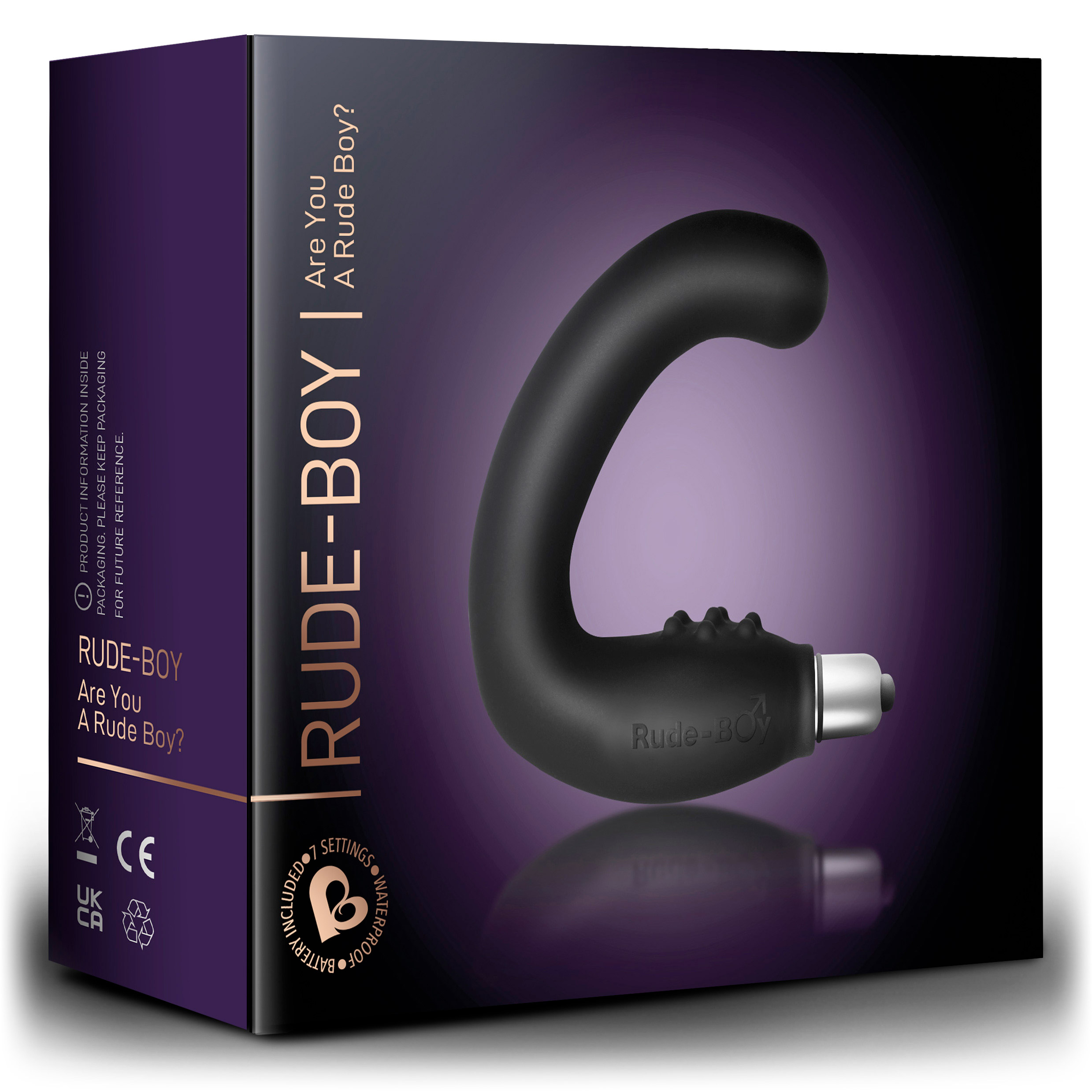 Rude-Boy is an extra clever dual P Spot stimulator that is oh so easy to use. Rude-Boys mid-size girth ensures you get firm and fitted stimulation together with perineum massage. The unique hands free design gives you the extra freedom to play with yourself or why not tantalize your partner while Rude-Boy delivers you an explosive treat. Now powered by a 7-Speed RO-80mm Bullet Measurements: Prostate Arm: 5 inches in length and 1.12 inches in diameter; Perineum Arm: 2.5 inches in length and 1.67 inches in diameter at widest point. Material: Silicone. Color: Black. Note: Bullet and battery, N(LR1), included. Waterproof.