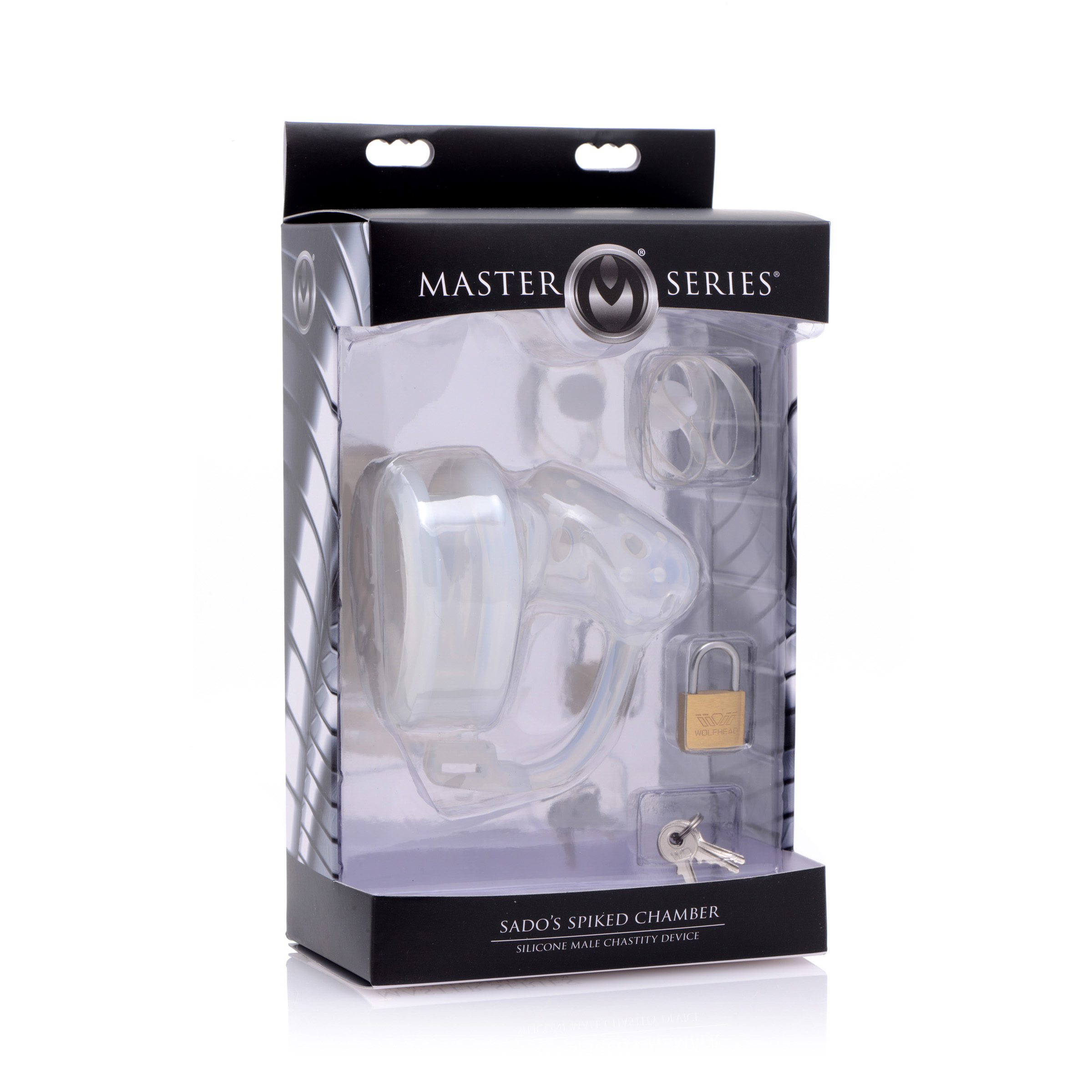 Satisfy your sickest desires when you put your slave into this sadistic chastity device! Tug his shaft and scrotum through the silicone ring and then push his cock into the spiked cock cage. The spikes are just hard enough to create the pain you want him in, without piercing the skin. Wrap the strap around the base ring and secure it in place with the white stud and lock. He will not be able to escape the evil confines of Sados Spiked Chamber! A cum-through hole allows him to urinate, making this device ideal for long-term wear. The premium silicone is non-porous and phthalate-free for a completely body safe experience.