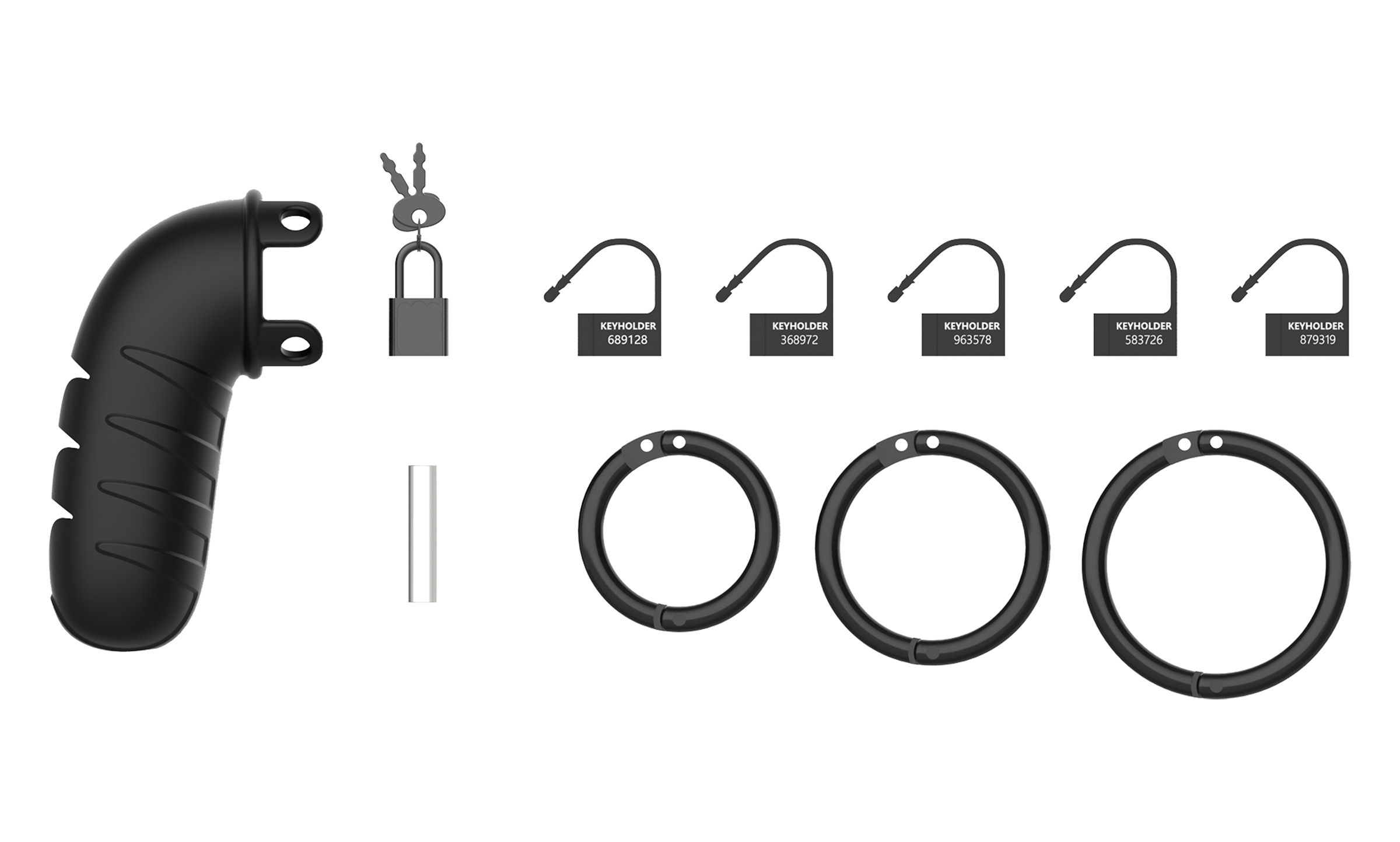 Whether you are trying orgasm denial, long-term chastity or simply want to prevent him getting an erection, The ManCage Silicone Chastity Cage is perfect for new and seasoned chastity explorers alike. Manufactured from soft high-grade silicone they are perfectly comfortable for long term wear, so you can enjoy the erotic restriction all day. Three polycarbonate rings in different sizes and distance pieces are completely customizable for the perfect fit A metal lock or tie-wrap lock can easily close the cage. The included tie-wrap locks ensure that they will not trigger the alarm of metal detectors at parties, festivals or even airports As hygiene is very important while wearing a cage, the silicone ManCage series is equipped with a variety of vents and a urination opening. The cage makes it impossible to get an erection and gives the key-holder optimal power over sexual gratification Measurements: Cage is 5.3 inches in length, 1.7 inches in diameter, with a 1.5 inch inner diameter. Inside diameter of rings measure 1.6 inches, 2 inches, and 2.4 inches. Material: Silicone, polycarbonate Color: Black Note: Includes lock, keys, 3 rings, and tie-wrap locks