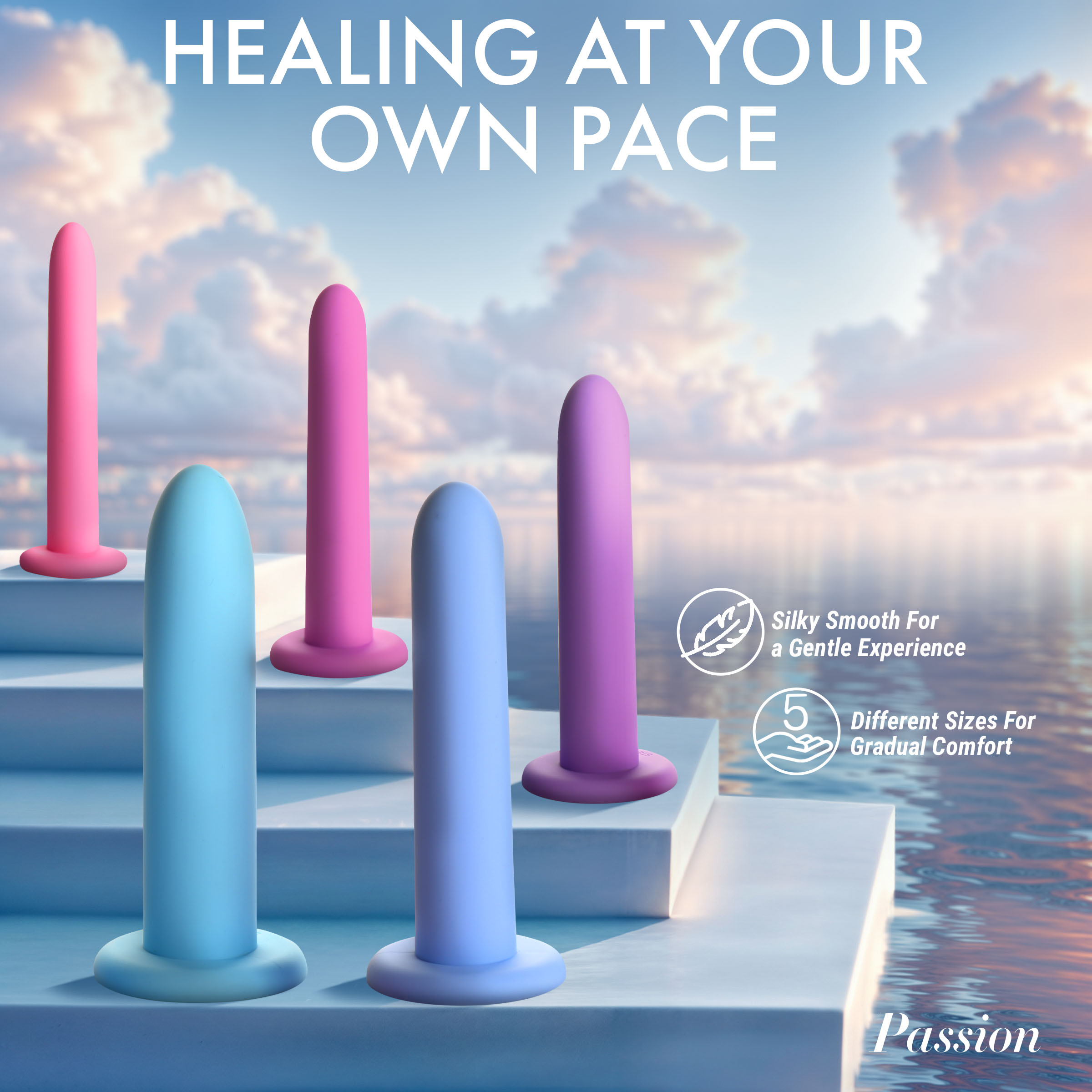 Introducing our premium-quality, body-safe silicone vulva dilator and kegal exercise set. Designed for gentle and comfortable use, each piece is made from silky smooth silicone that glides effortlessly with a touch of water-based lubricant. With five graduated sizes, this set allows you to build your confidence, strength, and control gradually, starting from the smallest size (Step 1) and progressing to the largest (Step 5). The smooth, tapered tip ensures easy insertion, and the suction-cup base lets you enjoy hands-free use on any flat surface. Perfect for those experiencing pain during penetration, these pelvic dilators can help you stretch your pelvic floor muscles and relieve tension effectively. They can be used to relax the muscles or, alternatively, you can squeeze them by doing kegels and strengthen the same pelvic muscles. Measurements: Step 1: 4.7 inches overall length, 4.4 inches insertable length, 0.7 inches widest insertable diameter Step 2: 5.2 inches overall length, 4.8 inches insertable length, 0.9 inches widest insertable diameter Step 3: 5.8 inches overall length, 5.5 inches insertable length, 1.1 inches widest insertable diameter Step 4: 6.3 inches overall length, 6 inches insertable length, 1.3 inches widest insertable diameter Step 5: 6.7 inches overall length, 6.3 inches insertable length, 1.5 inches widest insertable diameter Materials: Silicone Color: Pink, purple, blue Note: Use only with water-based lubricants.