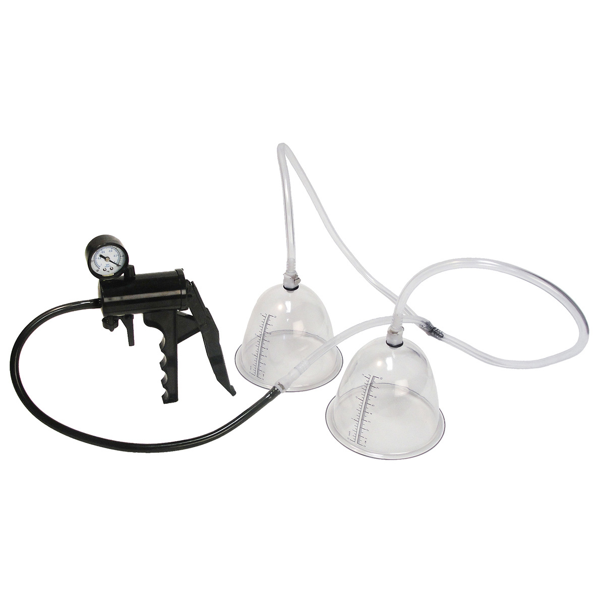 The Size Matters Breast Enhancement System is exactly what you need to give yourself fuller breasts. Each cylinder is made of industrial strength crystal clear acrylic and will fit comfortably over your breasts. With this system you can enhance your breasts to a nice full size in no time Just fit the cylinders over each breast and start pumping. Use the gauge to help get you to your full potential Kit contains premium handle pump with gauge, split connector hose, and 2 air lock breast cylinders. Measurements: Cylinders are 4.5 inches inner diameter and 4.25 inches deep, Material: Acrylic, PVC, ABS, Metal