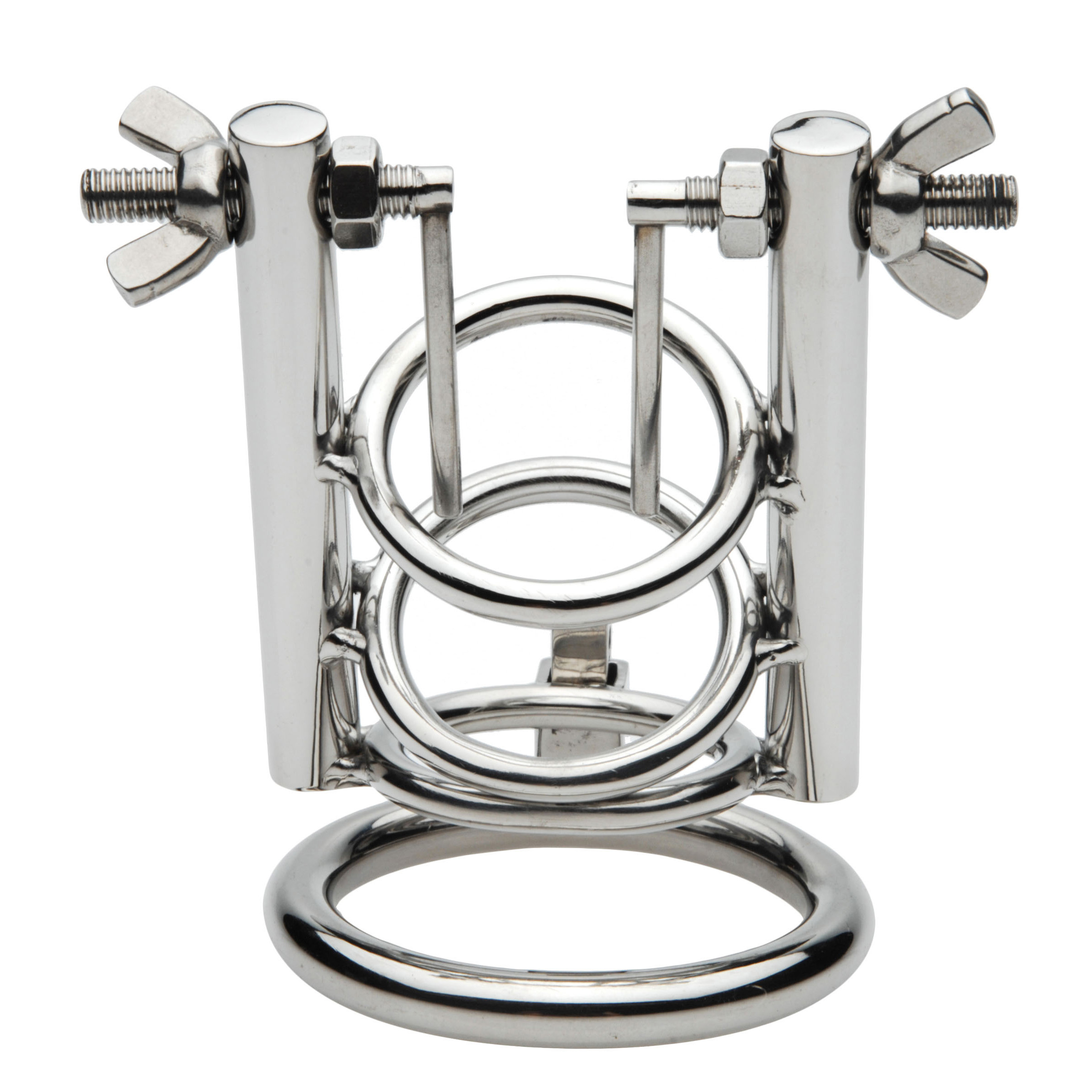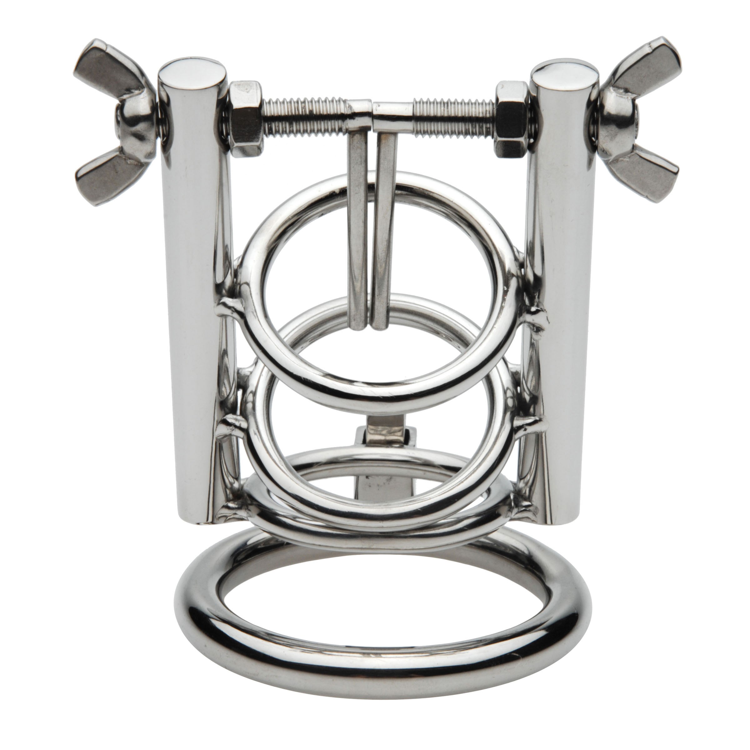 Delve into a world of pleasure and pain with this extreme CBT chastity cage that will take you to the limits of what you can endure. The two slim, smooth arms are designed to be inserted deep into the urethra, as you lock the ring around the base of the cock and balls. With every twist of the wing nut, the arms spread further and further apart, stretching the urethral opening wide open and leaving you gaping. Sized to be used even if you are flaccid, the three shaft rings will keep your cock steady as you are forcibly dilated. For safety, the urethral spreading arms are able to be closed by the wearer.