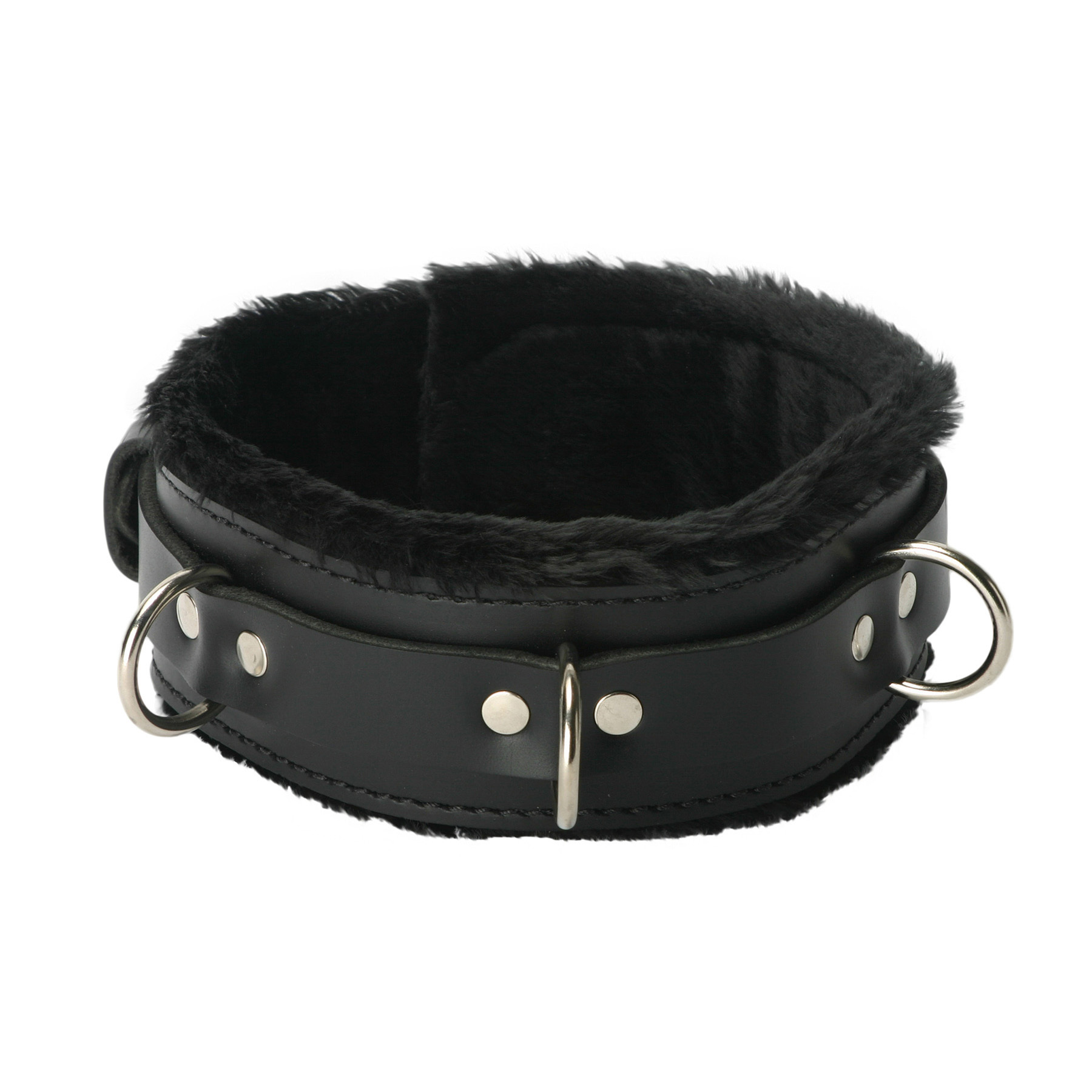This collar is the ultimate blend of comfort and durability. It is fundamentally a wide strap of thick leather lined with two layers of ultra soft faux fur. It is wrapped with a 1 inch wide leather strap. The lockable buckle on the strap is compatible with any small padlock. With the fur included, this collar is an impressive 2 3/8 inches wide. Nine sizing slots ensure a comfortable fit. Measurements: Collars are 2.38 inches wide, Small/Medium fits neck sizes from 13 to 19 inches around, Large/Extra Large fits neck sizes from 20 to 26 inches around, Material: Leather, Faux Fur, Metal, Color: Black
