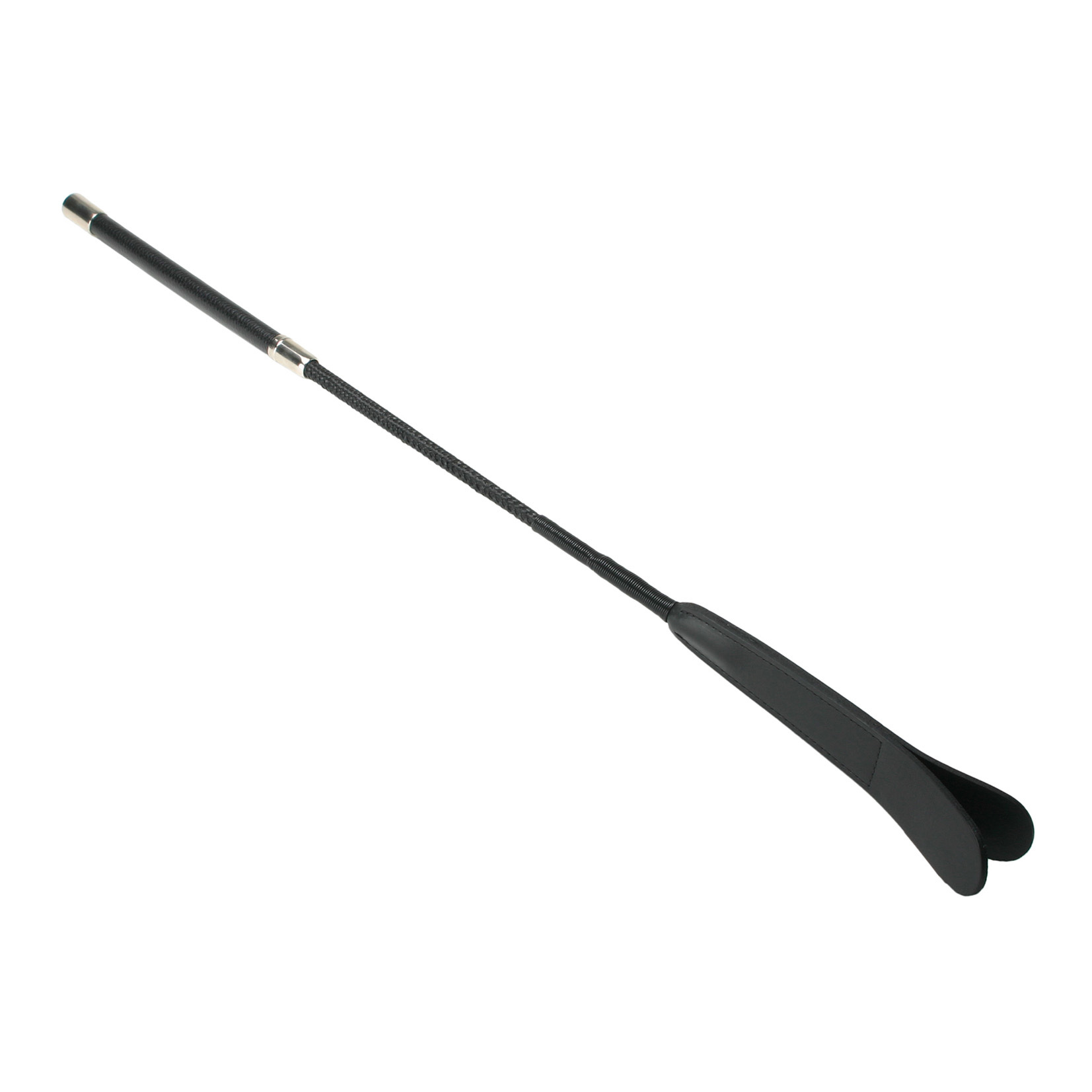 This premium leather riding crop is a fantastic impact tool. The handle is wrapped in a layer of leather with a metal tip. The shaft is rigid, but has a little flex, so on impact the split leather tip provides a nice bite. It measures 18 inches long.