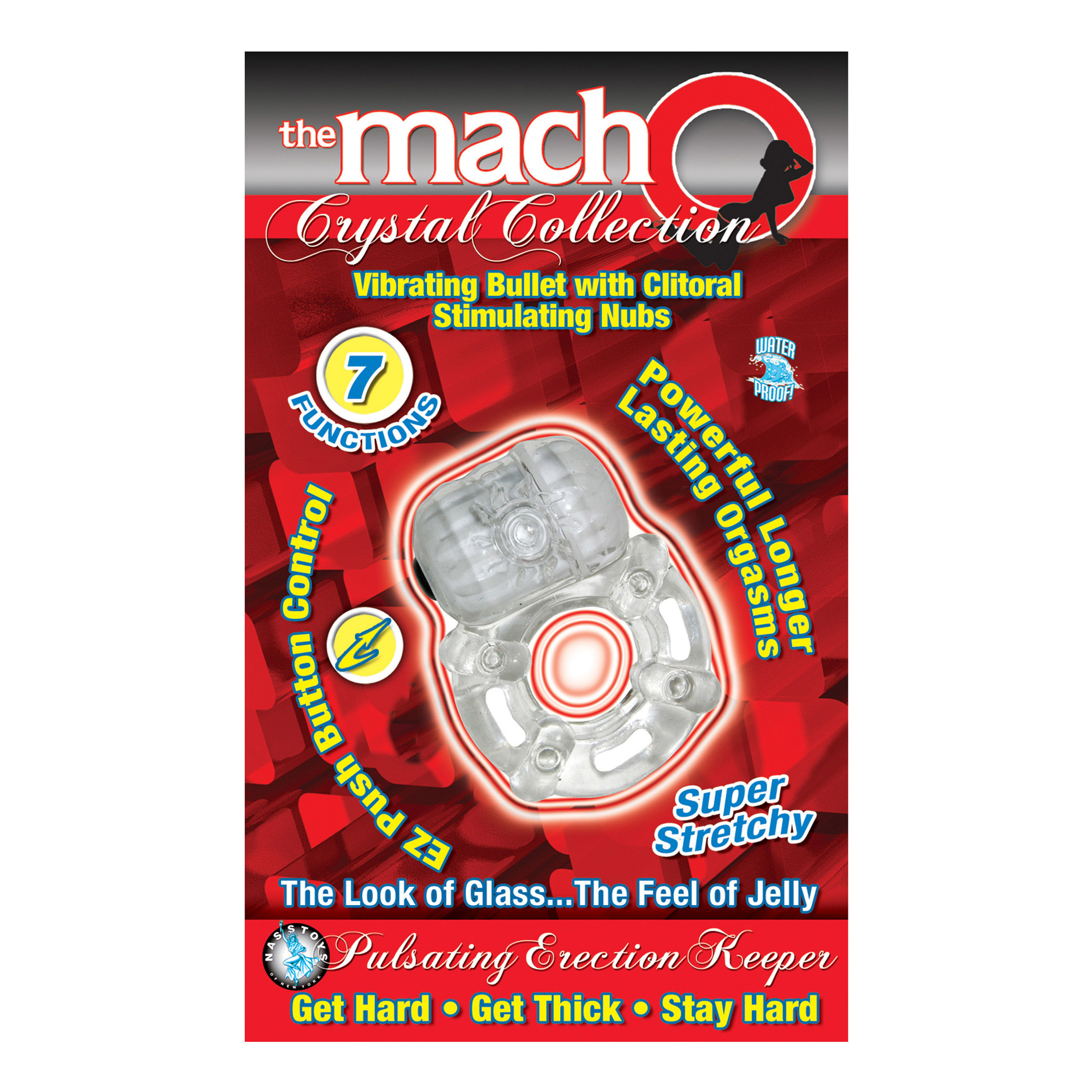 The look of Glass...The feel of Jelly The Macho Pulsating Erection Keeper is a super stretchy vibrating cockring that provides you with powerful, longer lasting orgasms. It features clitoral stim-u-nubs to enhance the experience for your partner, 7 vibrating functions, and a one touch on-off button. Batteries are included for immediate use. Measurements: 0.8 inch internal diameter (material stretches to fit), Material: SEBS, Color: Clear, Note: Waterproof, Phthalate Free, Requires 2 AG10 batteries, included