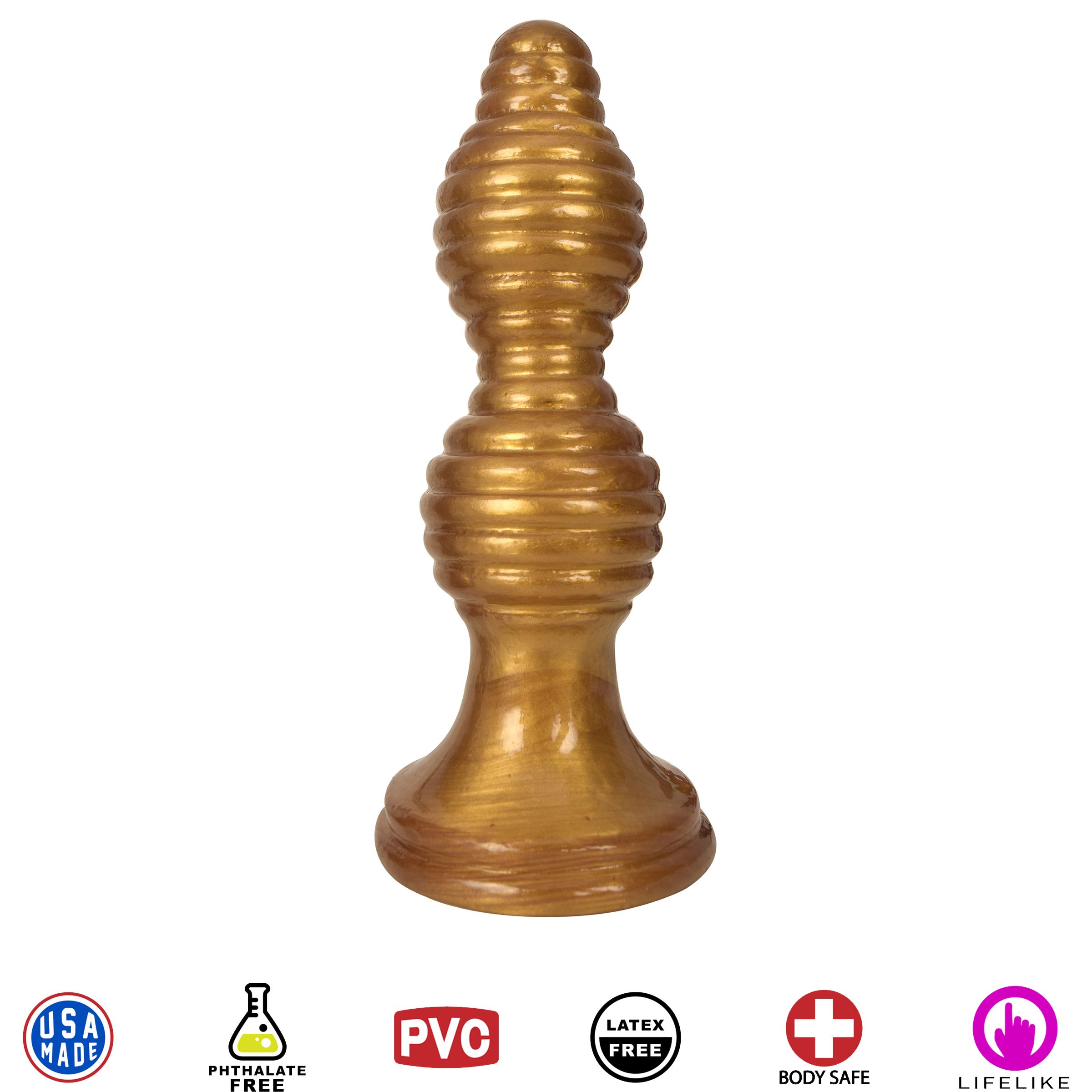 This superbly textured butt plug will give your anus the royal treatment Thickly ribbed twin spheres massage your sphincter and anal tunnel as they squeeze into your body. The wide, flared suction cup base stays firmly in place as you take it for a ride or play with a partner. Savor every bold ridge and swollen bulb along the considerable length Made of enhanced PVC, this plug is durable, pliable, low maintenance, and easy to clean. Use with water-based or silicone lubricant. Curve Toys is known for their ultra-realistic bio-skin formula used to create the best dildos and adult toys in the world. They manufacture their adult replica products in the USA with only body-friendly, phthalate-free, and top-grade materials. Their proprietary blend of bio-skin is mixed in-house, making them a leader in sexual health. All products are inspected for superior functionality so that they represent the value, quality, and innovation from the factory to the bedroom. Staffed by experts with over 60 cumulative years in the adult manufacturing, Curve Toys is the perfect combination of passion, creativity and experience; in short, we know pleasure. Measurements: 7 inches in total length, 6 inches insertable length, 1.9 inches at maximum diameter. Material: Phthalate-free PVC. Color: Gold. Note: Made in the USA.