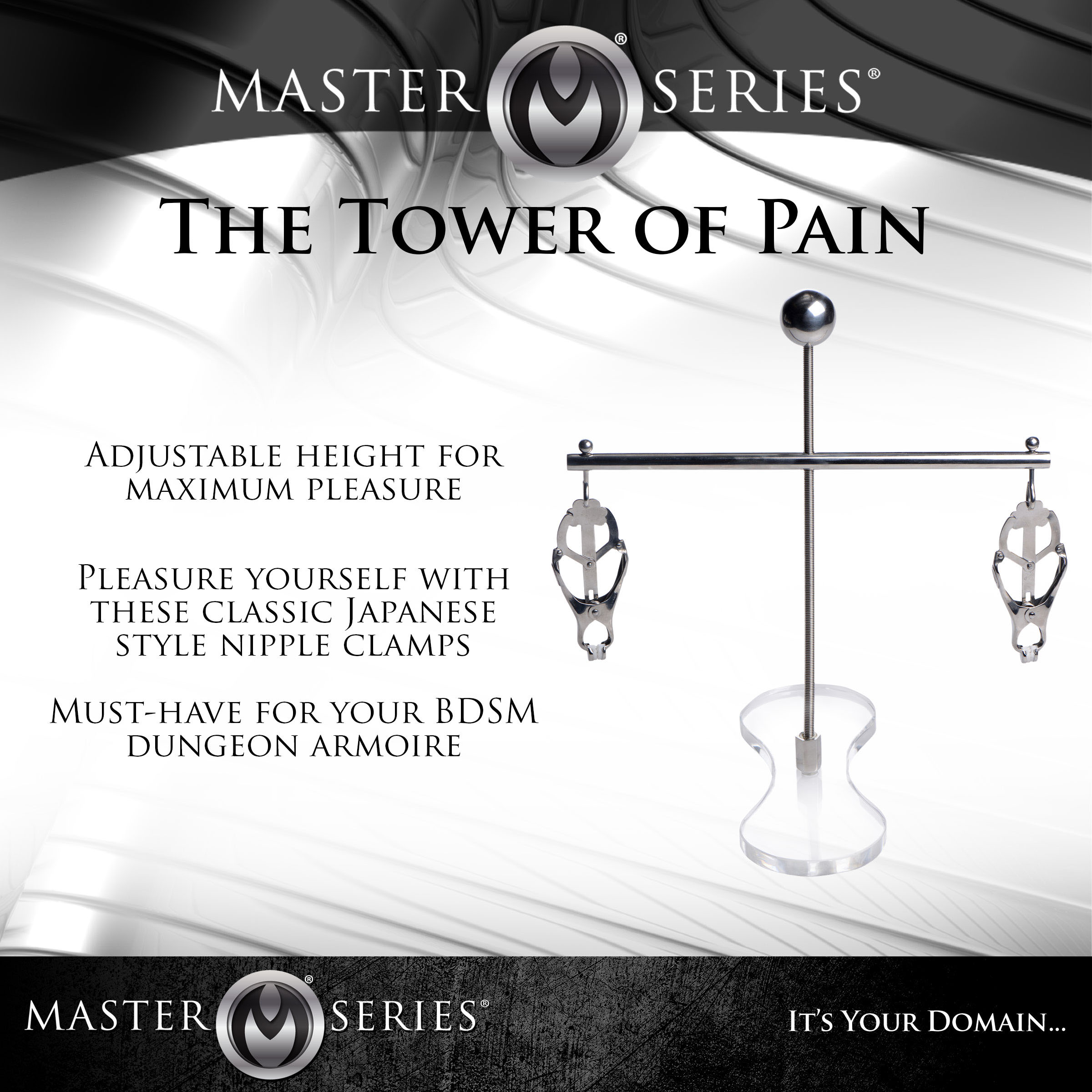 A simple yet very efficient design to help you squeeze and pull on your subs nipples. The Tower of Pain includes to two Japanese Clover Clamps at each end of the rod. Once claps are attached to their nipples, place the rest plate on top of there sternum and then screw in the ball rod and start stretching their nips! Simply turn the ball to pull the rod further away from their chest, making the clover clamps pull more. Keep them on the edge as they see you reach for the ball to turn it. Tower of Pain disassembles very easily for you to put away and put away or pack in your luggage.