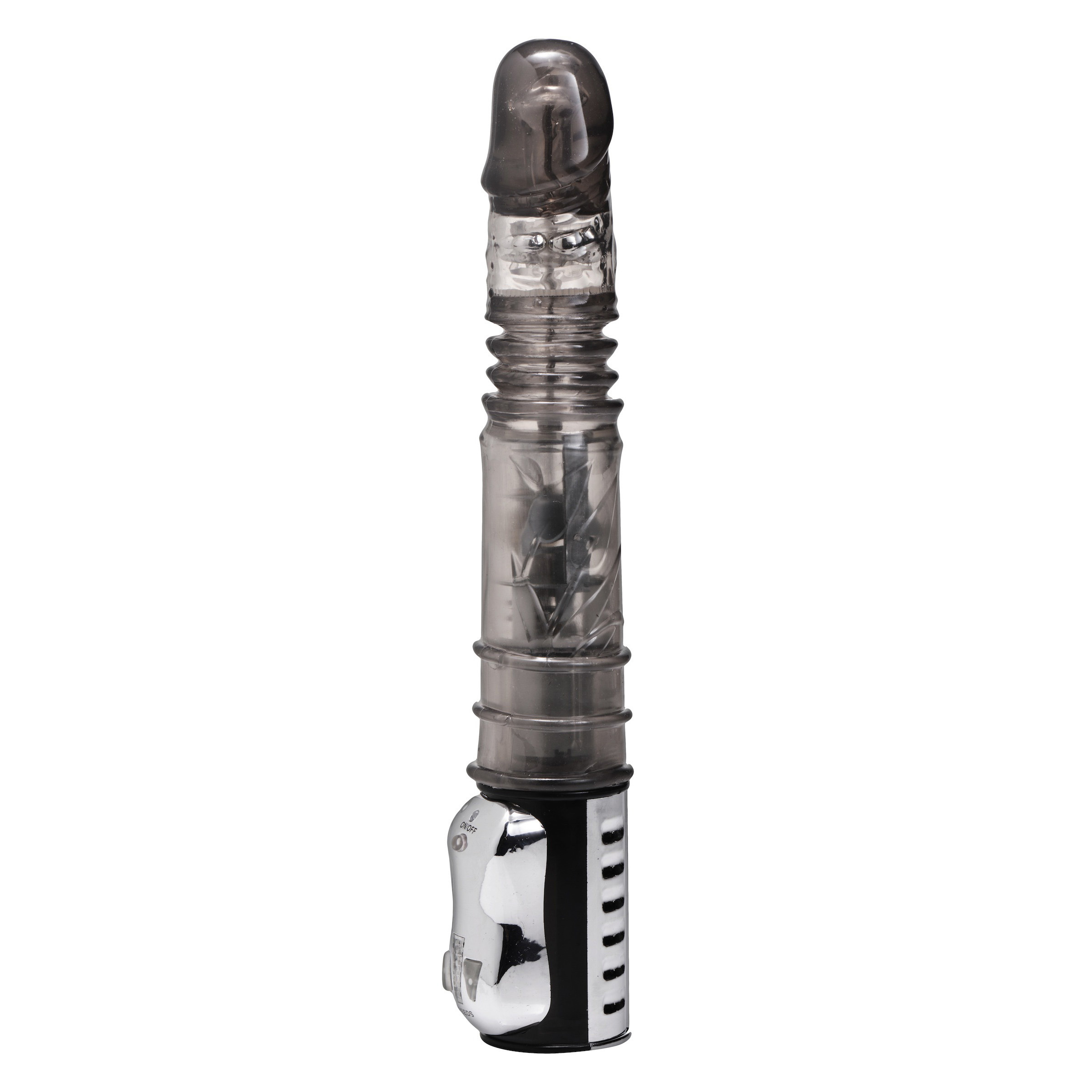 Introducing the revolutionary Thruster Sex Stick Expertly designed for anal play, this magnificent piece boasts a powerful motor that extends throughout the shaft. You can even see it working Non-jamming metal beads rotate at the top, coupled with a unique thrusting action for the push and pull of anal play. All this while the shaft is moving up and down and the head takes it up a notch by rotating in a semi-circular motion This toy is a must-have for anyone interested in taking anal play to a whole new level. Measurements: 11.5 inch overall length, 8.25 inch insertable length, 1.85 inch max insertable diameter, Material: TPR, ABS, Color: Smoke, Note: Requires 4 AA batteries, not included