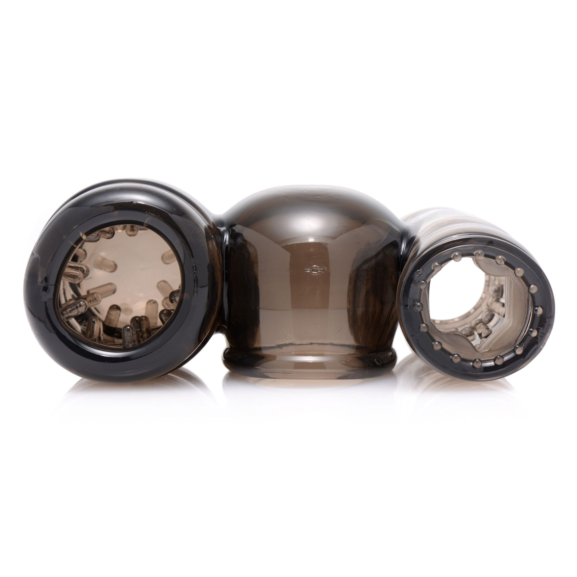 How long can you withstand this accessory that turns a massage wand into two tantalizing male sex toys? Perfect for orgasm denial or forced orgasm on your own or with a partner, this attachment slips easily over the head of a standard sized wand vibrator, providing two textured strokers that will thrum with the same incredible power as your massager. One stroker features a closed cup to target the head of the penis for pleasure, lined with soft tendrils to tickle and tease. The other stroker is open-ended to pleasure the entire shaft, lined with stimulating nubs for an unbearably intense massage with every thrust. Endure extreme vibrating ecstasy for as long as you can before exploding! Made of phthalate-free TPE, this pleasure tool can be used with both silicone and water-based lubricants.