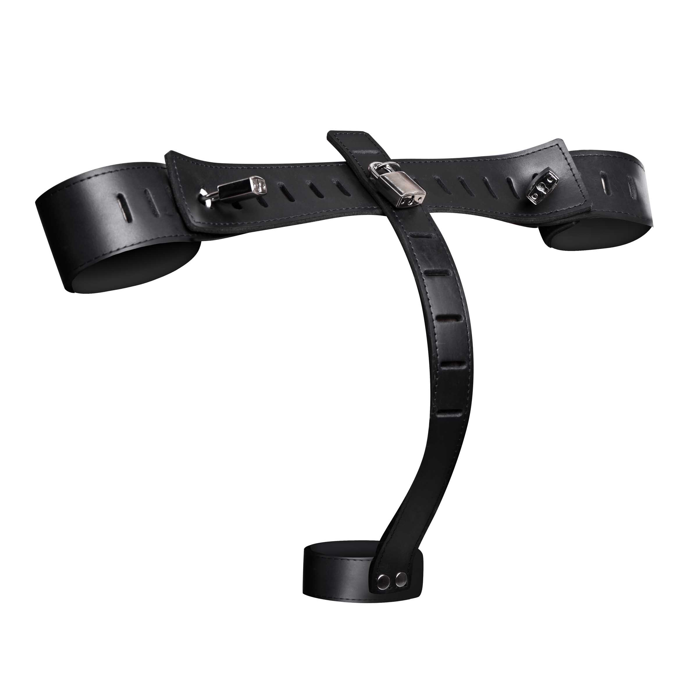 Keep your sub secure and helpless with this intense bondage and CBT device. Comprised of 4 adjustable leather straps, this set is designed to connect the wrists of your subject to their genitals, via the strap up the back. This set requires 4 locks to close (not included).