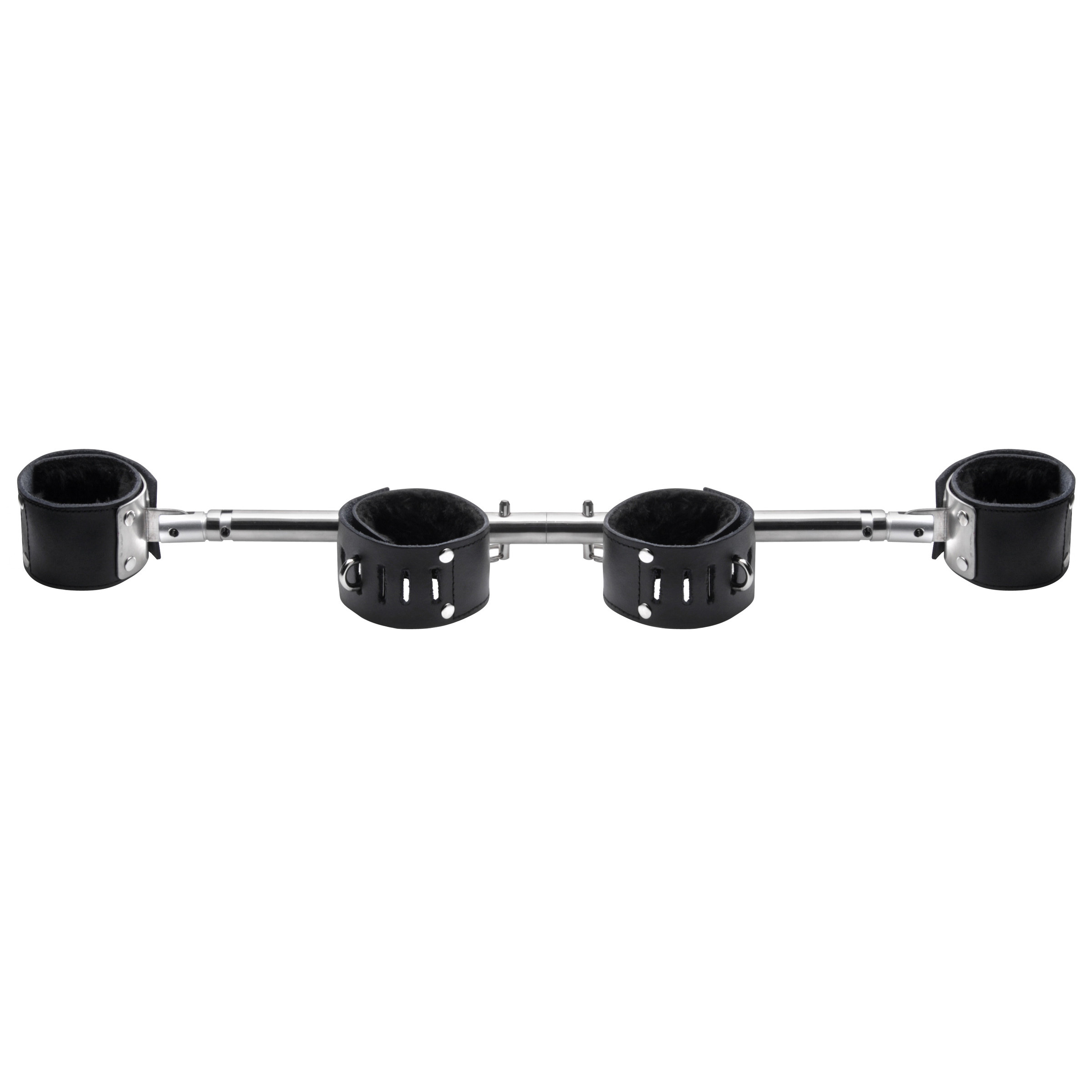 This sturdy yet lightweight spreader bar incorporates an innovative new feature that is sure to put it at the top of your wish list. The hollow aluminum offers secure featherweight restriction, aided by 4 adjustable leather cuffs . The fixed cuffs in the middle are secured at the back with a metal plate for extra sturdiness. Each cuff at the end of the bar is attached to a pivoting joint, which allows the cuff to be rotated in practically any direction. The cuffs are secured by a squared ring, to which a padlock may be attached. The pivoting ends give the bar unsurpassed comfort and maneuverability, letting you wear the bar longer, and in many more positions.