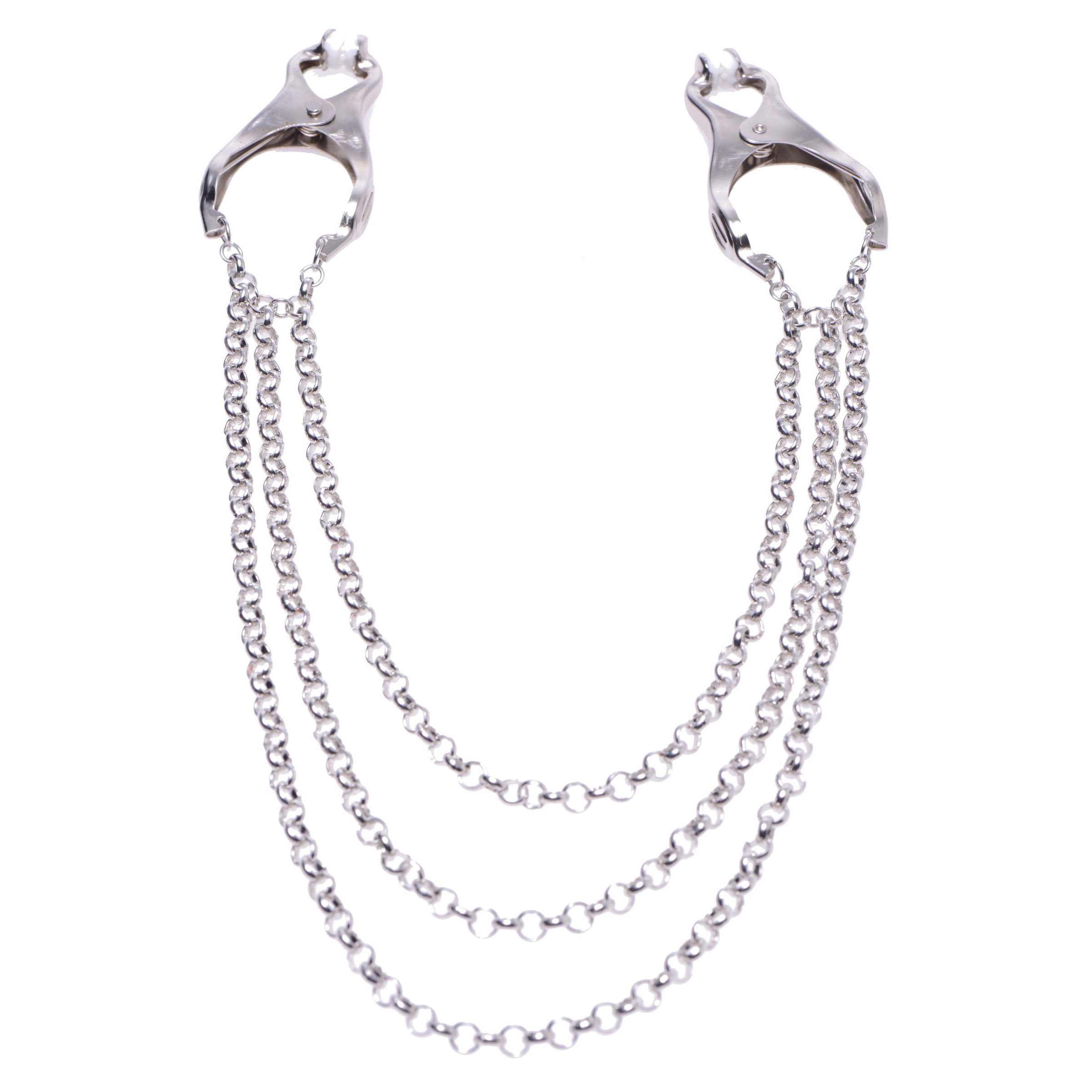 Please your partner with the stunning aesthetic of these unique nipple clamps. The extreme grip tip keeps them firmly on your lovers nipples, pinching for the perfect combination of pleasure and pain. Easy to use, these clamps can be utilized quickly and efficiently in the heat of the moment, or more ritualistically during your play scene. Attach weights to the chains for additional sensation play to send your masochist over the edge. This beautiful set of clamps is not only stunning to look at, but will provide the stimulation that your partner craves.