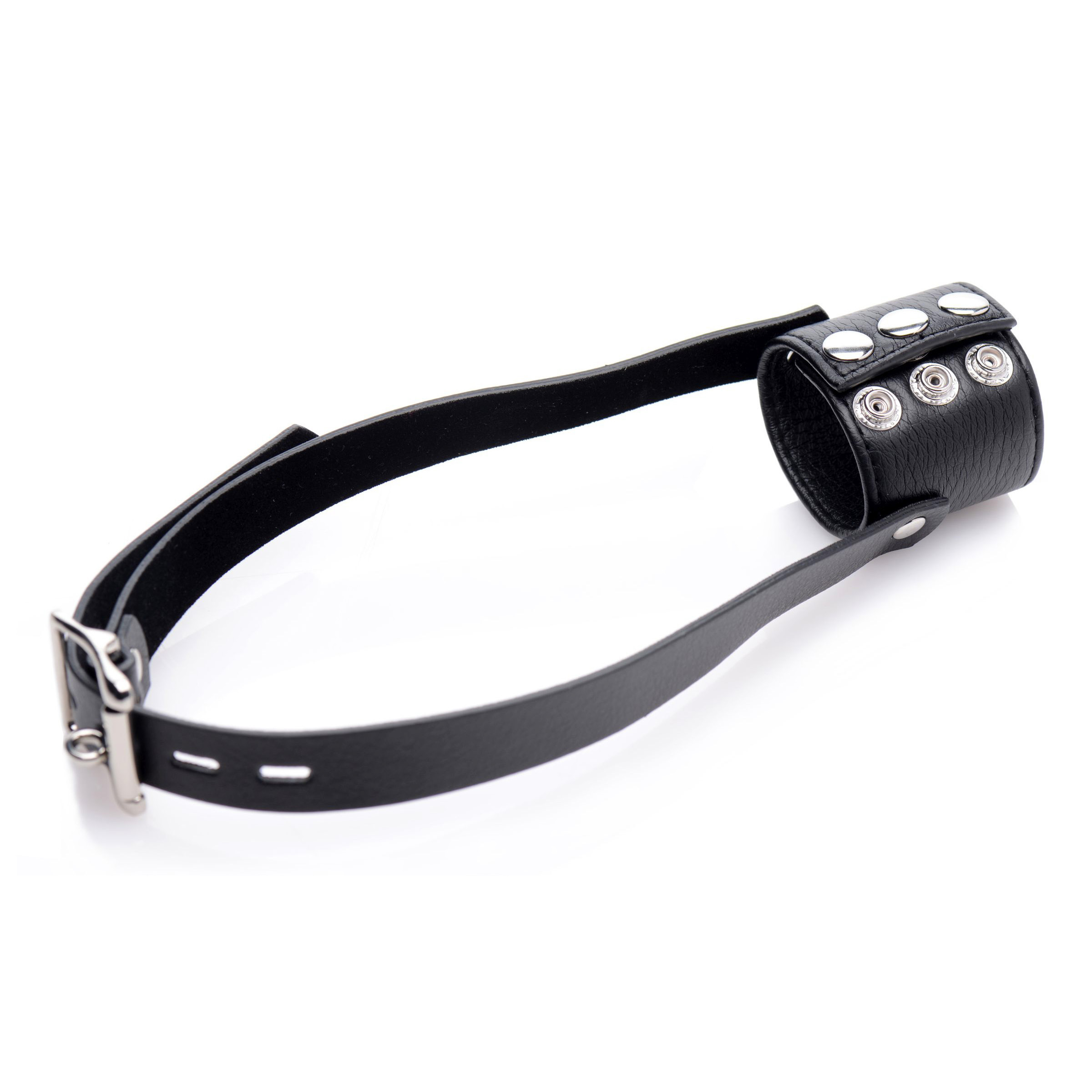This unique gag connects your playthings mouth to your balls while they are stretched! Wear it while you masturbate so they are forced to suck your scrotum, or just keep their face stuffed in your groin to remind them of their place! The stretcher will tug down on your balls while you wear it, creating pleasure sensations as you get closer and closer to the edge. Adjust it between two levels of tightness with the easy-to-use snap closures. The strap that wraps around your partners head is also easy to adjust, with a locking buckle that will ensure they have no hope for escape! A velvety interior will feel soft against their cheeks as they are kept in their predicament!