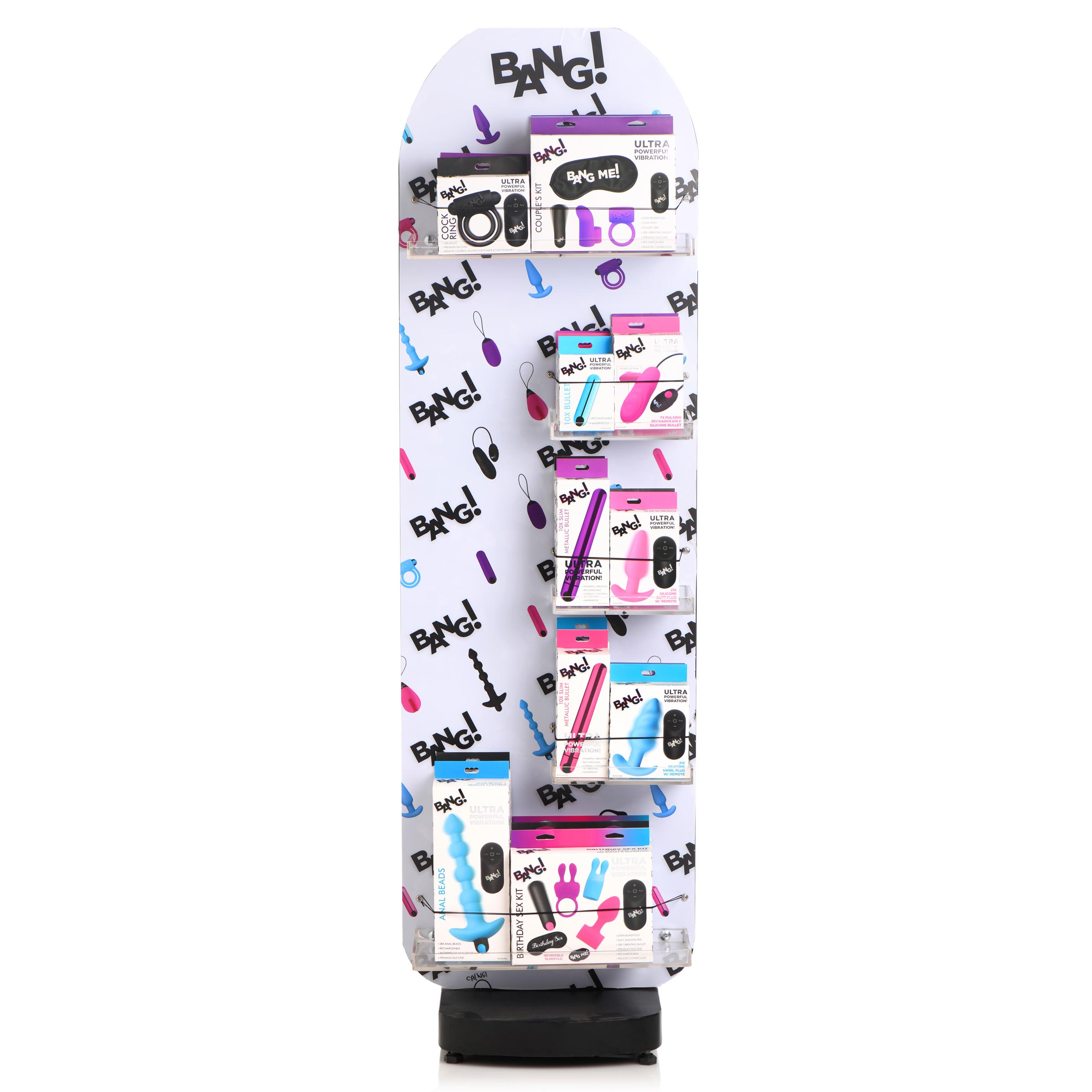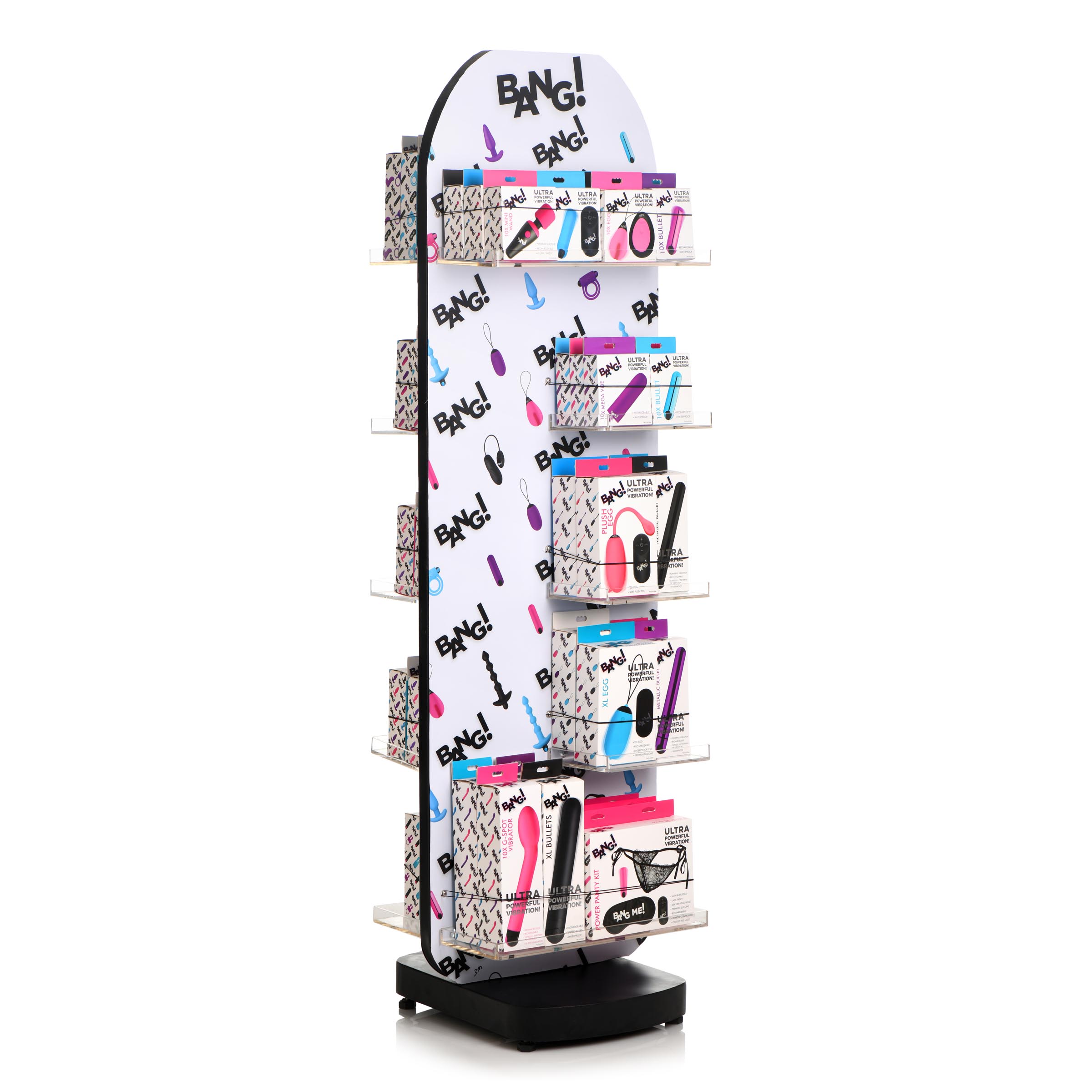 This eye-catching display really stands out and gets attention! With popping, bright colors and a fresh, white background, this display has a fantastic range of Bang! products to explore. Every kind of vibrator offered by Bang! is included in the display. Show off vibrating butt plugs with a variety of swirls and shapes, powerful bullet vibes, mini wands and mega vibrators, G-spot vibrators, anal beads, vibrating cock-rings, vibrating eggs, and remote controlled vibrators. There are also specialty themed kits such as the Power Party Kit, the Couple's Kit, the backdoor Adventure Kit and the Birthday Sex Kit to inspire and arouse! All items come in multiple colors such as pink, blue, purple and black. With so many options, this display is perfect for couples and individuals to find lots of options to choose from! Measurements: 67 inches in height, 17 inches in width, 16.7 inches in depth Color: Black, Blue, Pink, Purple Components: 3 - Mini Silicone Wand (1 each Black, Blue, Pink) 8 - Slim Metallic Bullet (2 each Black, Blue, Pink, Purple) 2 - 10X G-spot Vibrator (1 each Blue, Pink) 3 - 10X Mega Vibrator ( 1 each Blue, Pink, Purple) 2 - Birthday Sex Kit 9 - 10X Vibrating Metallic Bullet (2 each Black, Pink, Purple) (3 Blue) 2 - Vibrating Anal Beads with Remote (1 each Black, Blue) 2 - 28X Plush Egg with Remote – Pink and Blue 2 - Couple’s Kit 3 - Power Party Kit 1 - Duo Blast 1 - Backdoor Adventure Kit 4 - Silicone Cock Ring and Bullet w/ Remote (1 each Black, Blue, Pink, Purple) 2 - Silicone Swirl Plug with Remote (1 each Blue, Purple) 2 - Silicone Butt Plug with Remote (1 each Black, Pink) 2 - 7X Pulsing Rechargeable Bullet (1 each Pink, Purple) 3 - 10X Vibrating Egg with Remote (1 each Black, Blue, Pink) 3 - Vibrating Bullet with Remote (1 each Black, Blue, Pink) 2 - XL Vibrating Egg (1 each Black, Blue) 2 - XL Vibrating Bullet (1 each Black, Purple)