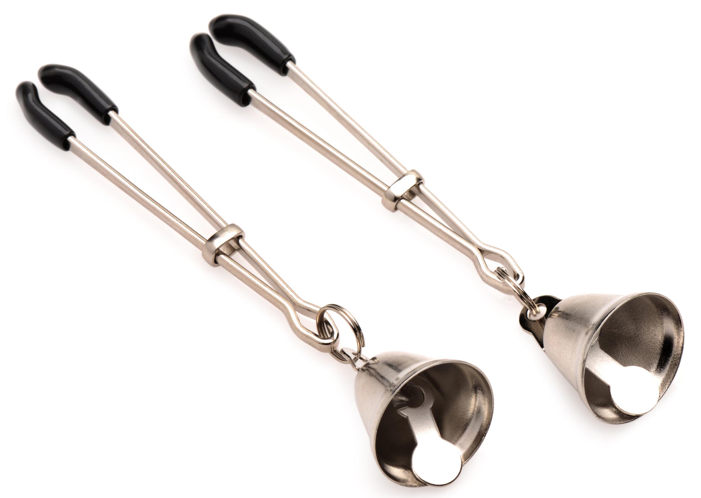 Audio erotica is in play when these devious little bells are ringing. Your plaything will look and sound tantalizing when these clamps are placed just so. These tweezer style nipple clamps have a bell attached at each end that makes a low pitched ringing sound when in motion. The vinyl coated ends provide comfort and grip while the sliding ring allows for varying amounts of pressure. Ideal for beginners and clamp aficionados alike. Measurements: 4 inches in height, opens to a maximum width of 0.5 inches. Material: Metal, vinyl. Color: Silver